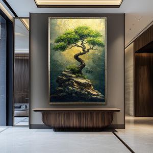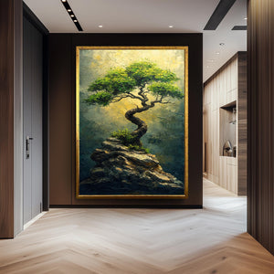 The Resilient Tree Canvas Print captures the strength and beauty of nature with a twisted tree thriving atop a rocky cliff, bathed in warm golden light. This textured canvas print brings modern abstract art into your living room or bedroom, inspiring balance and calm through its rich details. Measuring from 8"x12" up to 40"x78", this hand-stretched canvas offers custom canvas sizes to perfectly fit your space, making it ideal for earthy home decoration or zen inspired art.