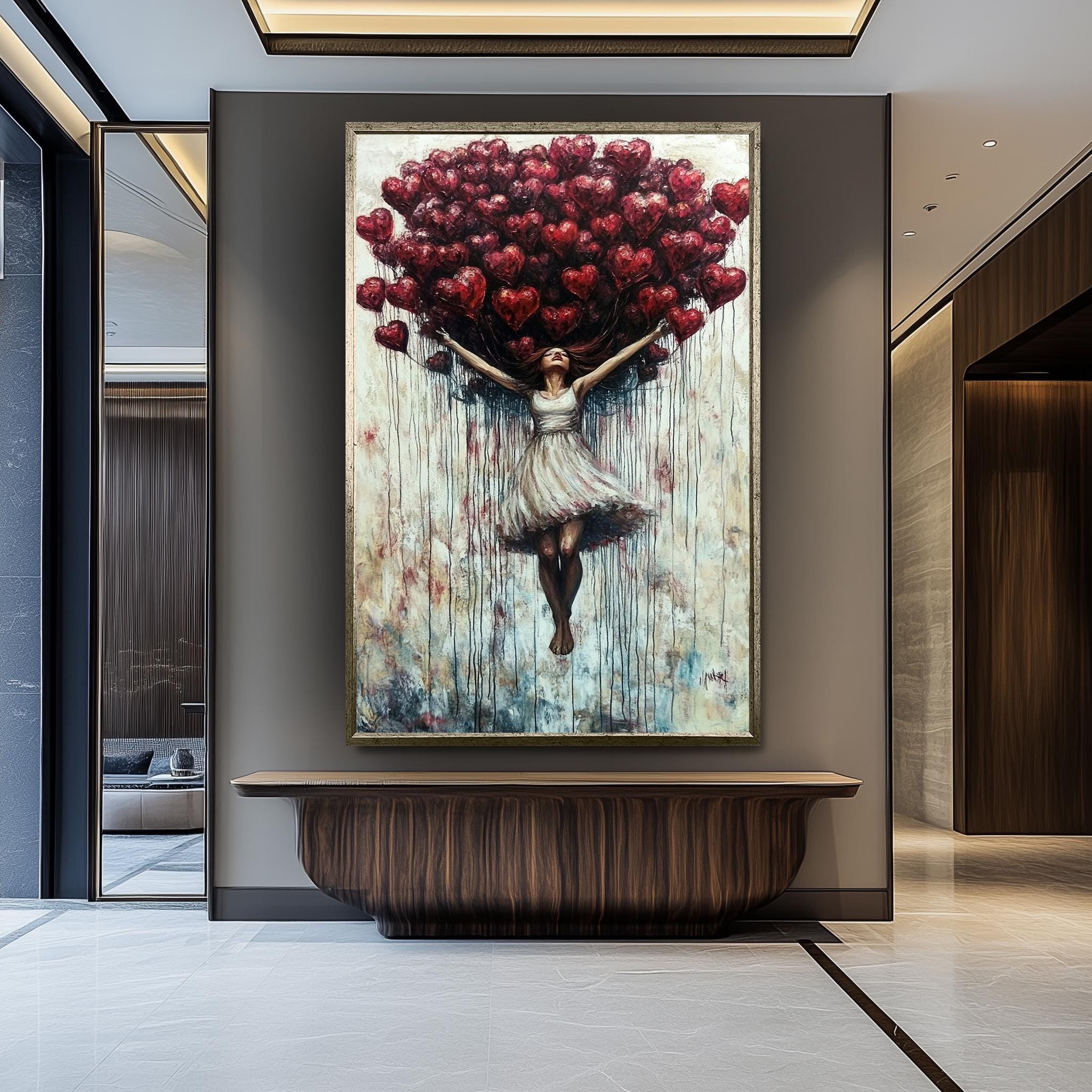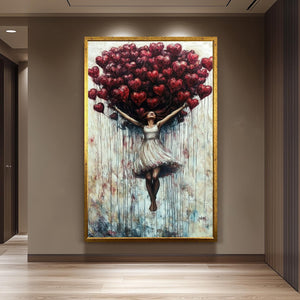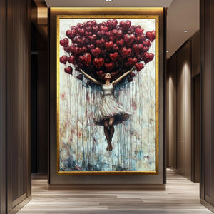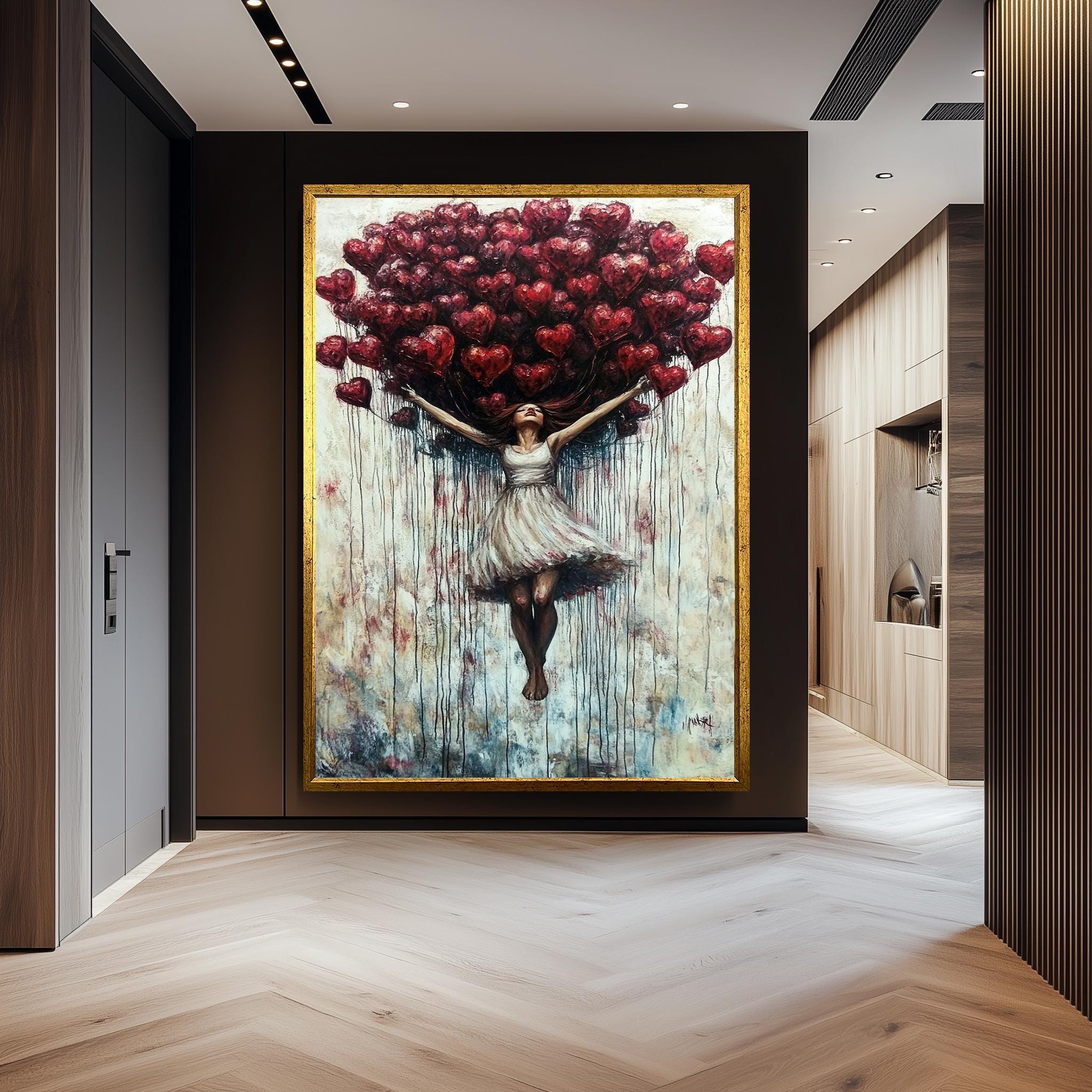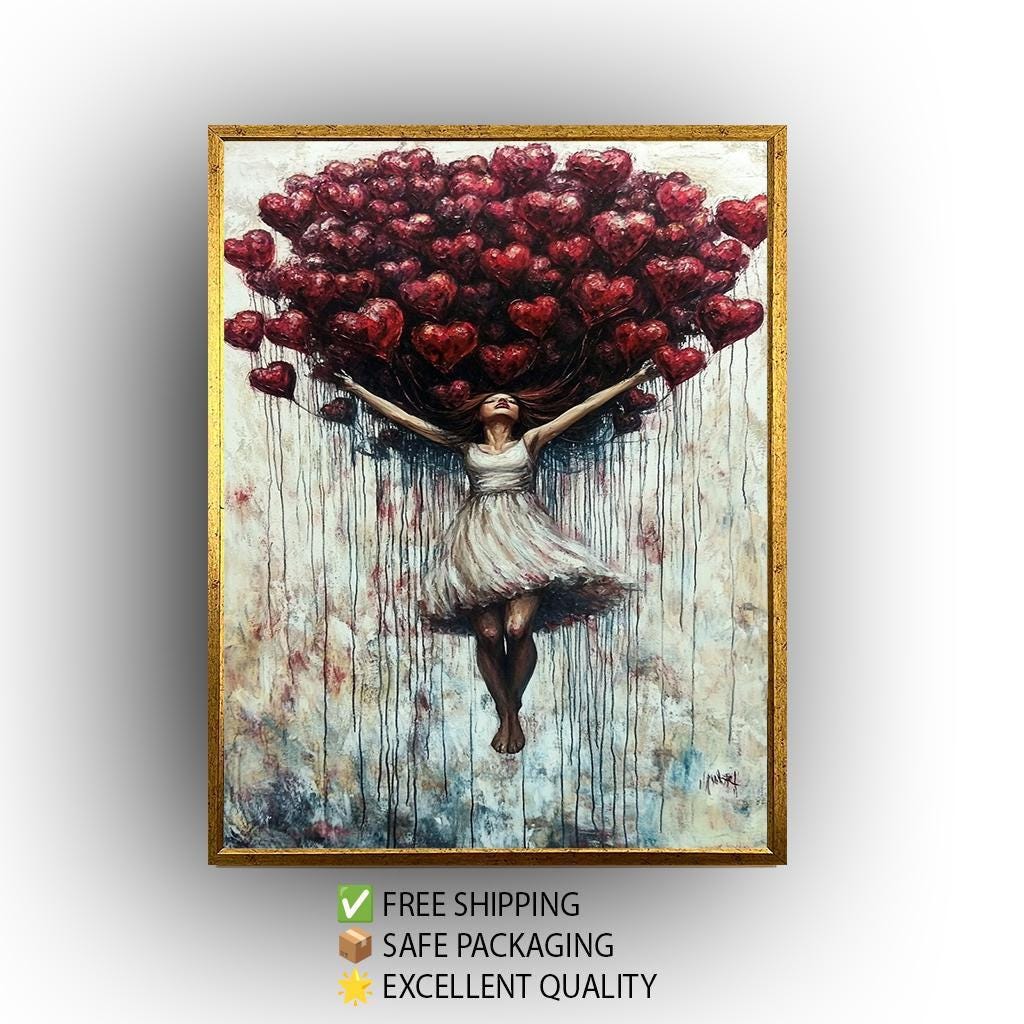 This romantic wall art titled "Woman With Heart Balloons Canvas Wall Art Romantic Surreal Print, Whimsical Modern Painting For Contemporary Bedroom Or Living Room Decor" brings a dreamy and emotional touch to any living space. Featuring a woman lifted by vibrant red heart balloons, this canvas wall decor captures love and freedom with expressive brushstroke art that conveys both whimsy and depth. Measuring from 8"x12" up to 40"x78", this love themed canvas fits perfectly in bedrooms, living rooms, or creative spaces, making it the ideal whimsical bedroom art or modern living room decor.