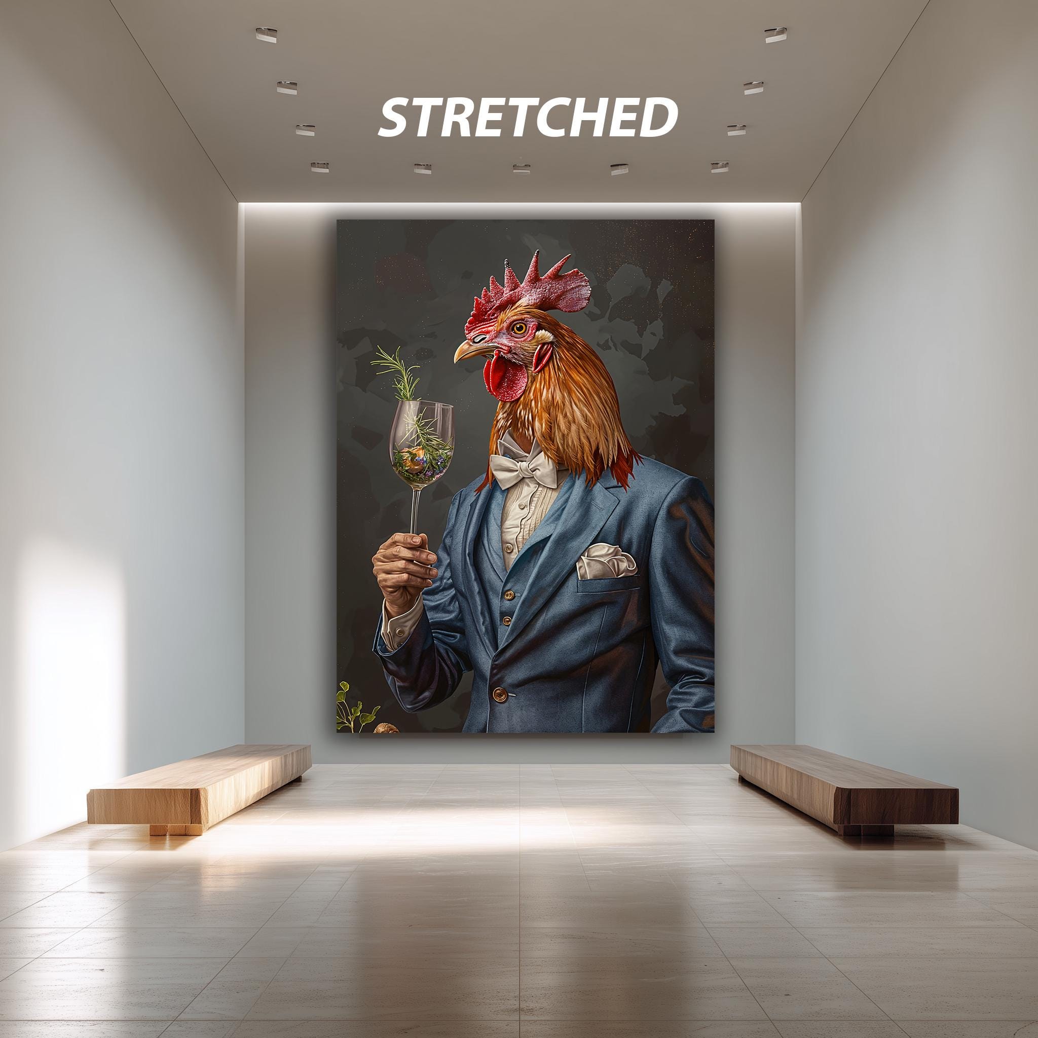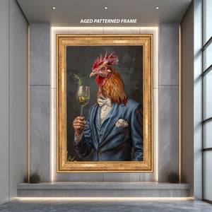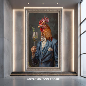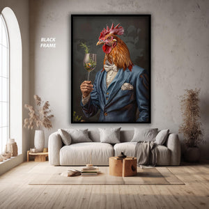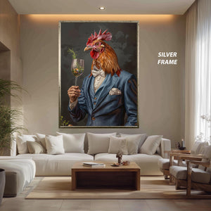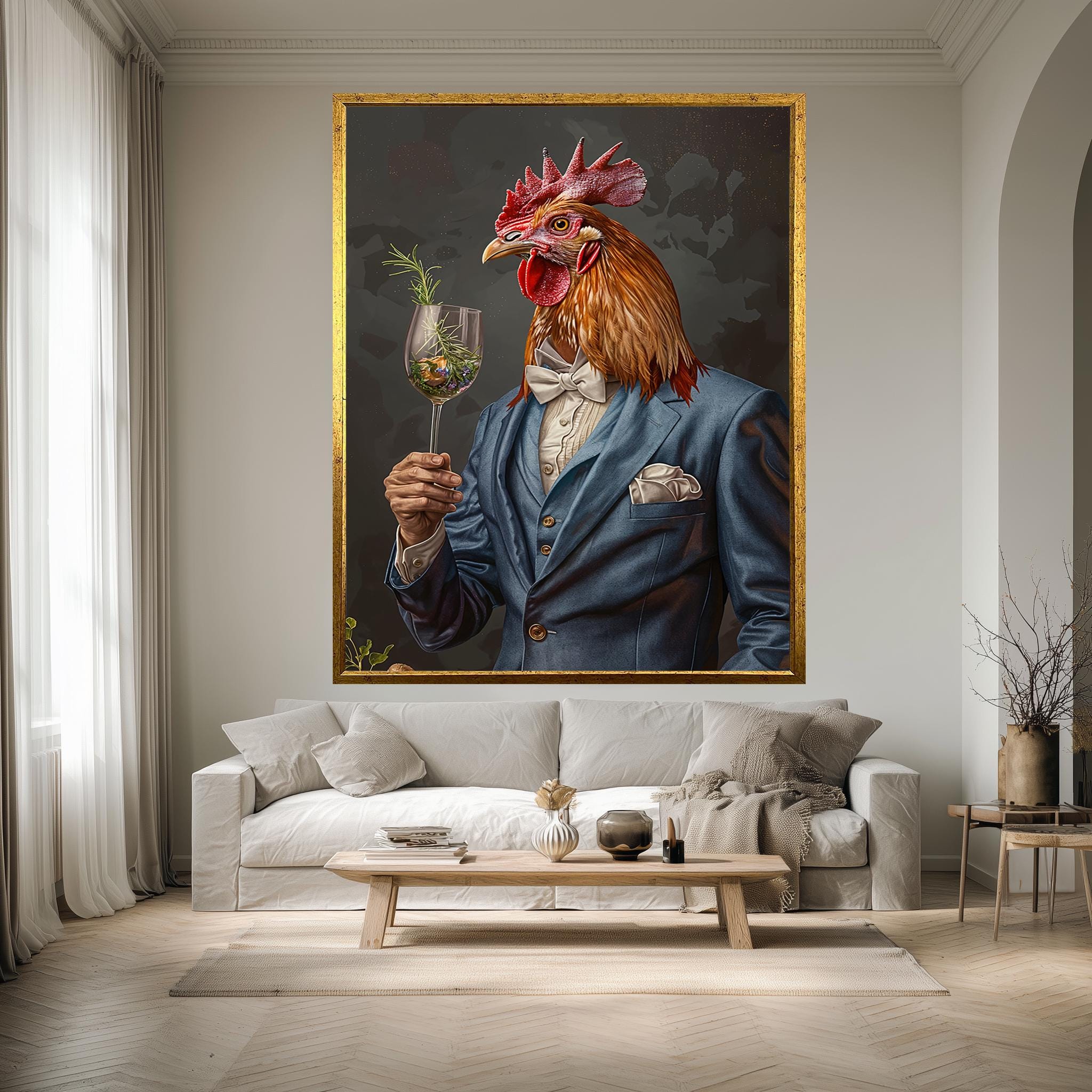 Bring warmth, humor, and sophistication to your living room, bedroom, office, or bar area with this unique rooster wall art print. This funny chicken print transforms any space into an inviting gallery of contemporary animal print art while celebrating the charm of anthropomorphic artwork. Elevate your farmhouse wall decor or bar room decoration today with this captivating cocktail art decor piece that effortlessly blends fun and style.