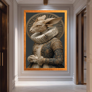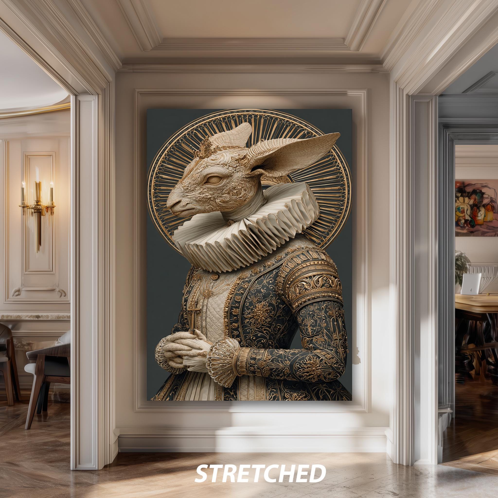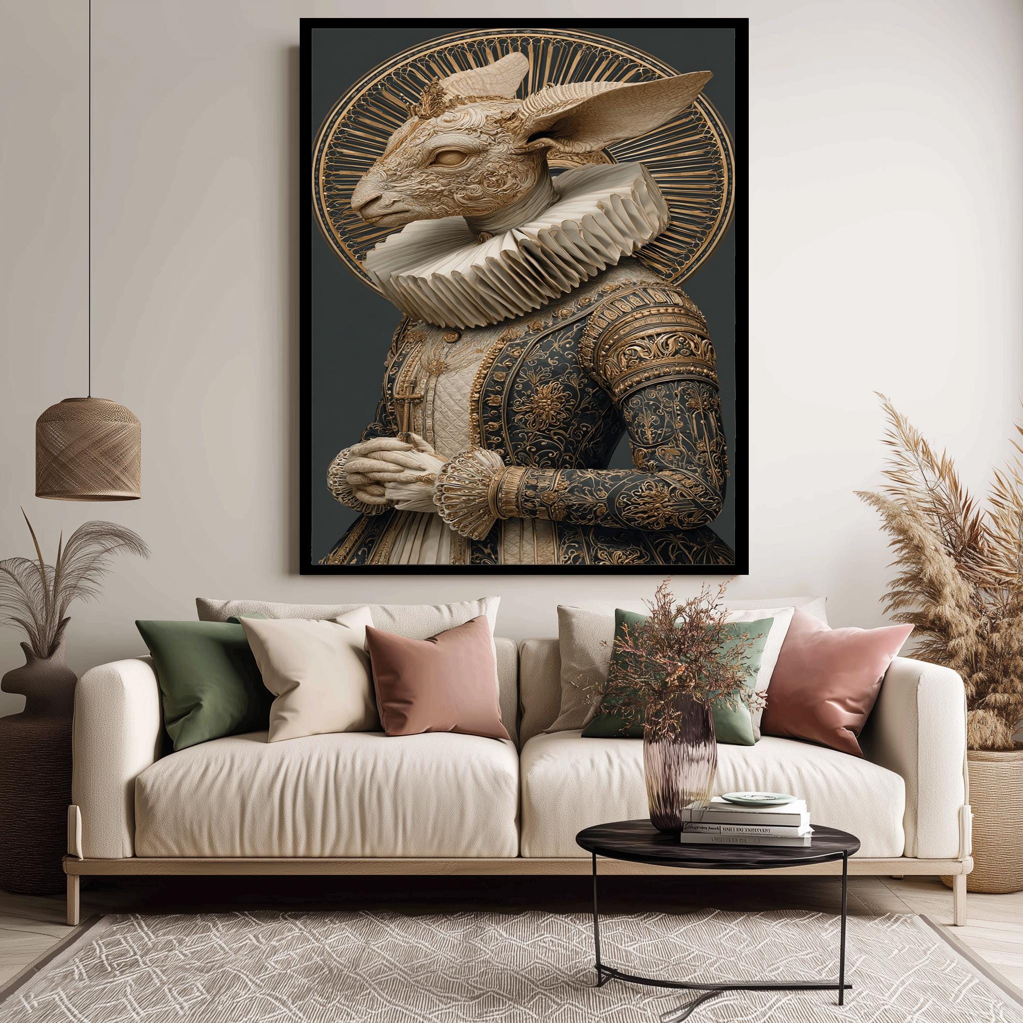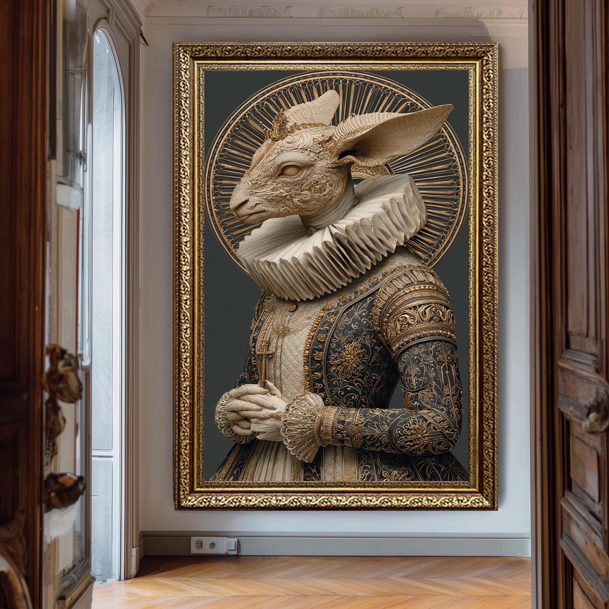 This sacred rabbit art print brings a unique blend of baroque animal portrait style and gothic halo print elements to your digital wall decor collection. Designed as an anthropomorphic wall art piece, this surreal rabbit print captures the mystical essence of fantasy creature print with ornate animal artwork details. Perfect for those seeking fantasy animal decor that combines religious style art with a golden rabbit image, this canvas wall decoration transforms any room into an inspiring gallery space.