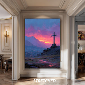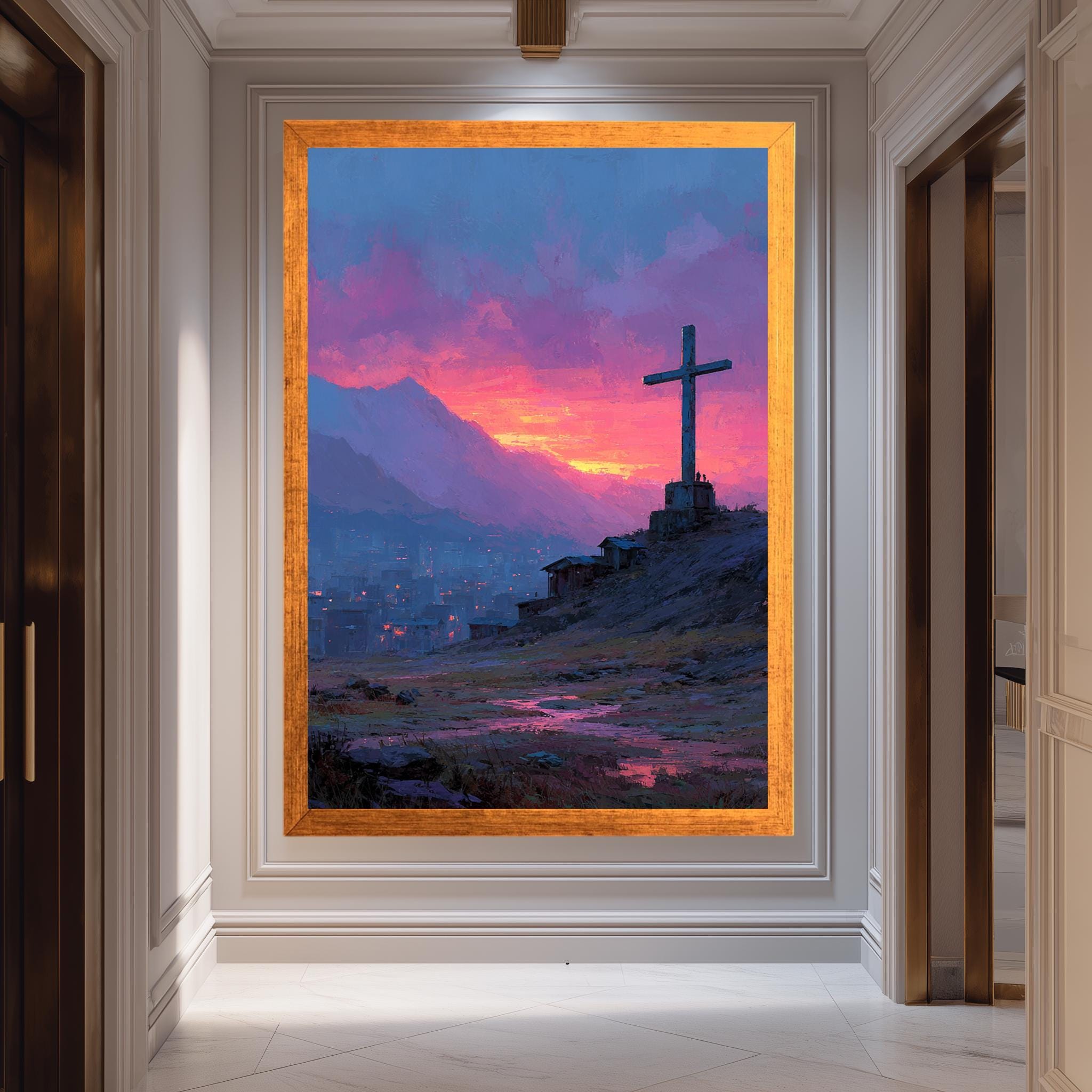 This Sunset Cross Landscape Digital Print is a stunning example of spiritual landscape art that brings inspiration and serenity to your living space. Featuring a vibrant mountain painting artwork with city lights, this digital canvas print combines abstract expressionism print techniques with faith inspired decor to create a unique Christian wall art piece. Designed for those seeking inspirational home decor, this contemporary canvas art transforms any room into a modern gallery wall art showcase.