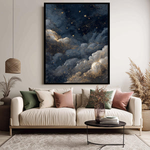 Starry Cloud Wall Art – Celestial Galaxy Cloud Poster with Dark Blue Gold Accents