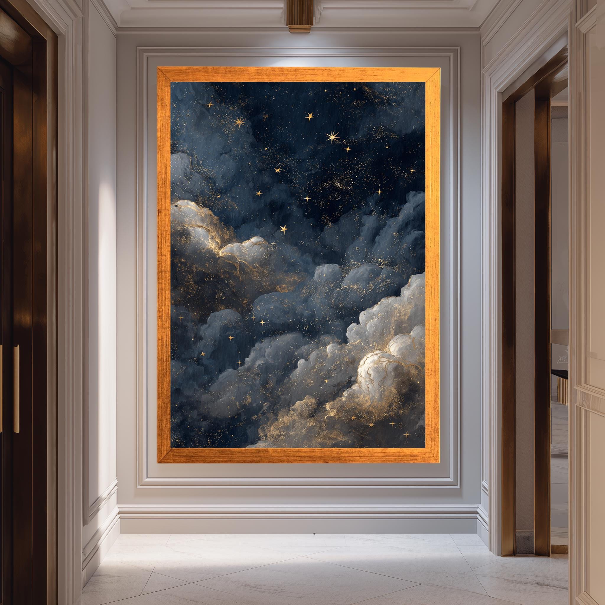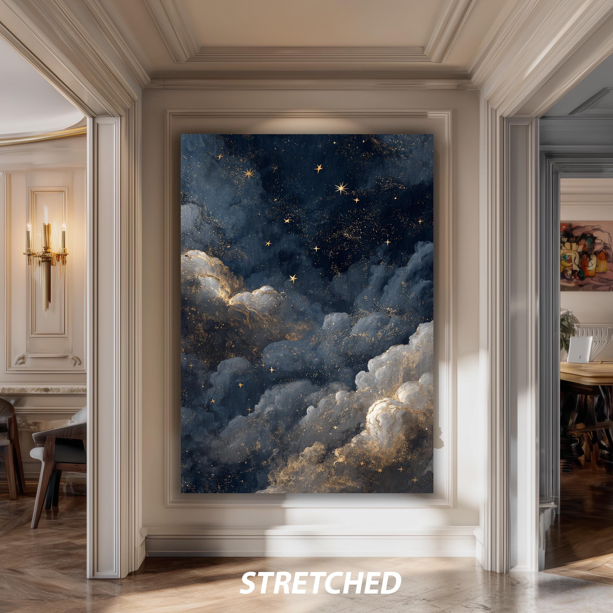 This starry cloud wall art printable captures the magic of a dark blue gold night sky, bringing dreamy sky artwork into your home for a calming and inspiring atmosphere. Designed for astrology bedroom art lovers and anyone seeking elegant space print decor, this celestial wall print blends cosmic room decor with modern canvas decor to transform your walls. Featuring a rich palette of deep blues and shimmering golds, this digital celestial art piece evokes the vastness of the galaxy cloud poster theme while offering a soothing meditation wall art experience.