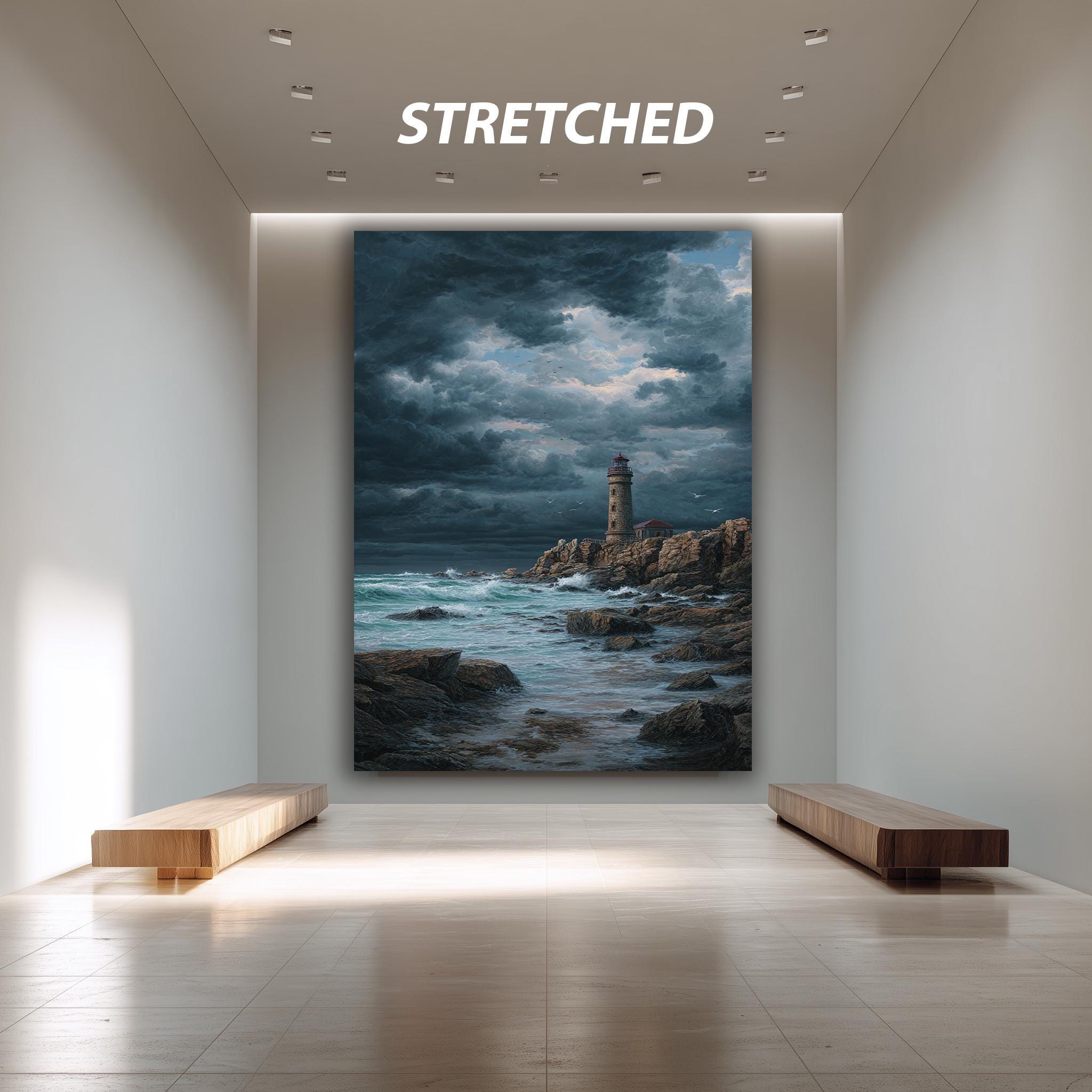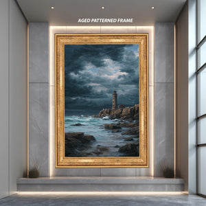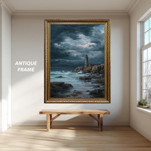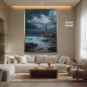 The Stormy Lighthouse Art Print captures the dramatic beauty of a rocky shore under a turbulent sky, making it the perfect coastal wall decor to bring the power of the ocean into your home or office. This nautical art poster features a vivid depiction of an ocean storm canvas that highlights a moody coastal wall art scene, offering a bold and emotional maritime landscape poster that complements mid-century modern decor and minimalist ocean painting styles.