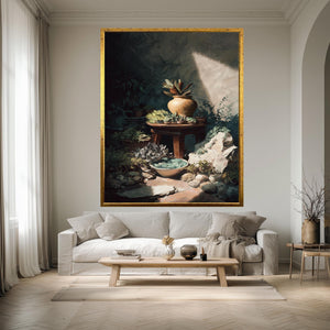 - The still life nature print captures the essence of rustic garden decor with a focus on natural textures and sunlight effects.