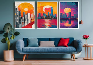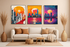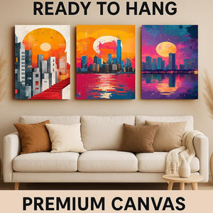 The Sunset Cityscape Canvas Print is a vibrant 3-piece canvas art set designed to transform your living room wall decor or office wall art decor with colorful, modern city wall decor. This urban skyline wall art captures the dynamic sunset canvas atmosphere of metropolitan style canvas, blending radiant orange, pink, purple, and deep blue tones to create a stunning contemporary home accents display. Each abstract cityscape painting is printed on premium cotton canvas using eco-friendly inks that ensure vivid colors and sharp detail, making this colorful canvas art set a lasting centerpiece.