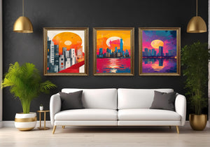 • Set of three high-quality canvas prints showcasing abstract cityscape painting with vibrant sunset colors