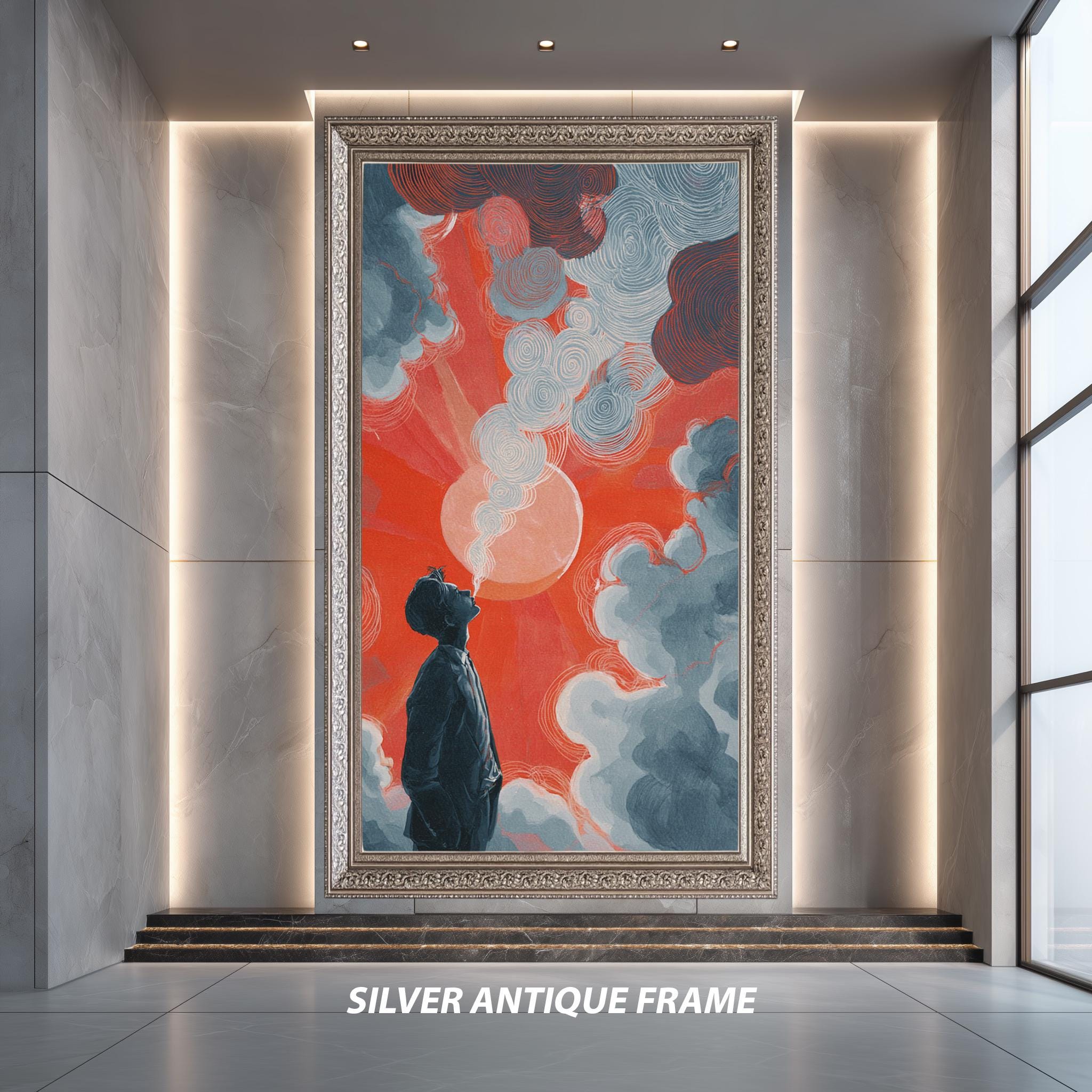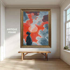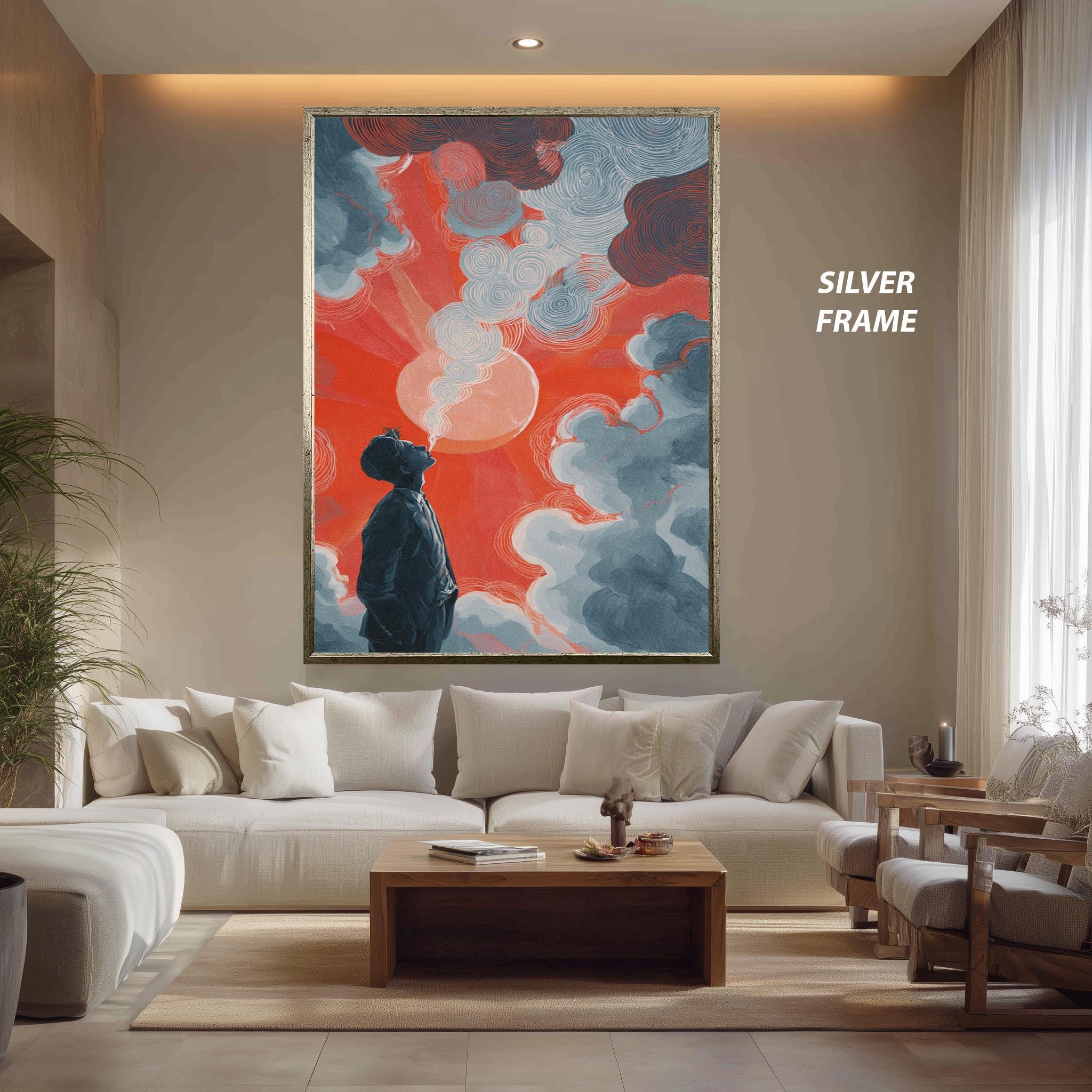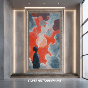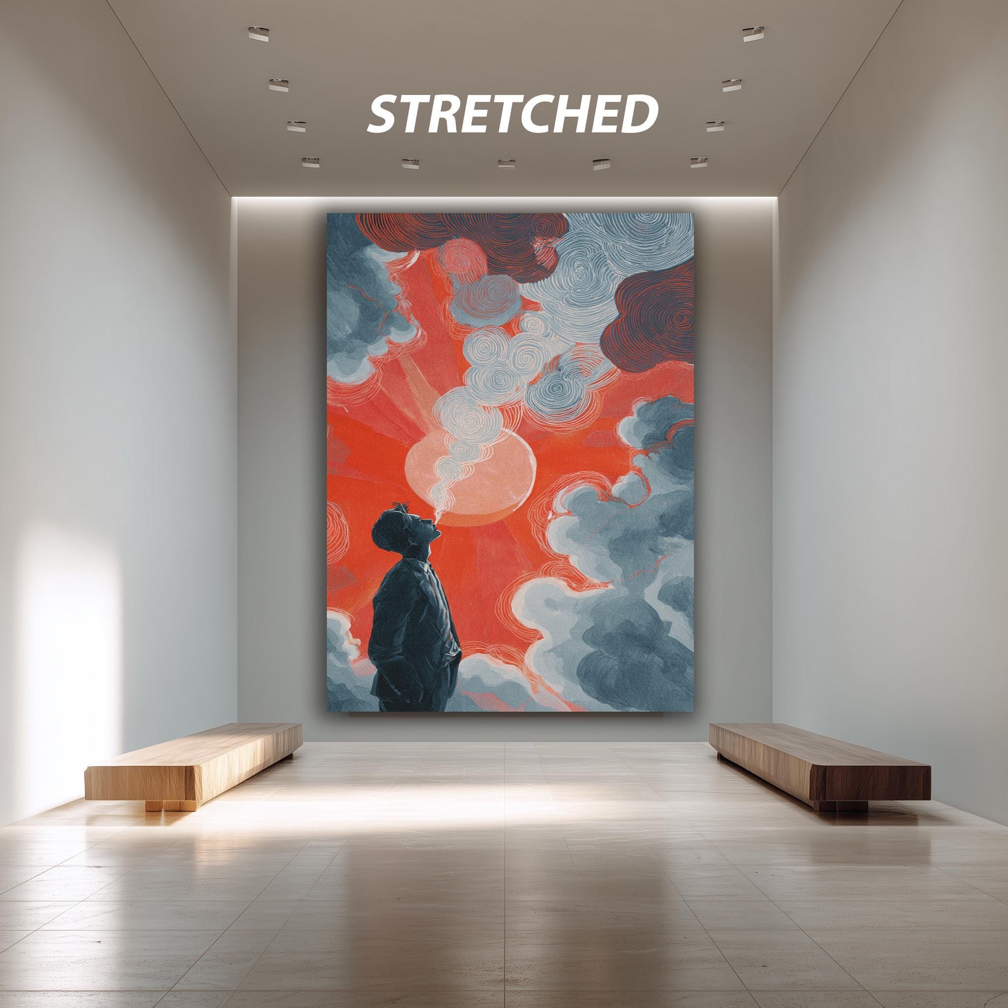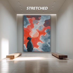 This surreal art print, titled Surreal Man and Sky Illustration Print with Red Sun and Dreamy Clouds, brings a unique blend of psychedelic canvas print elements and emotional abstract poster qualities to your space. Inspired by color field painting, this modern art poster uses deep blue tones and a striking red sun painting to evoke thoughtful emotions, making it perfect for fans of abstract wall art and minimalist wall decor. The gallery wrapped canvas construction ensures durability while enhancing the visual impact of this contemporary art print.