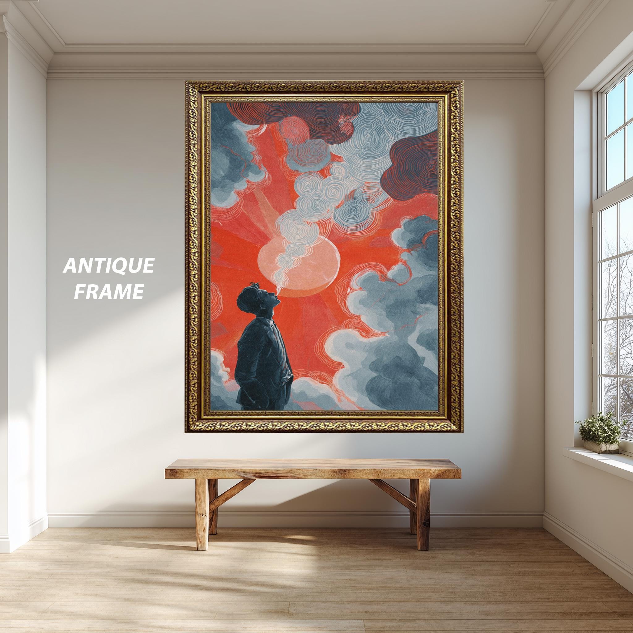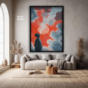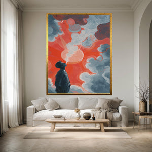 - Surreal art print featuring dreamy clouds artwork and a bold red sun painting for visual drama
