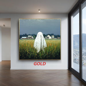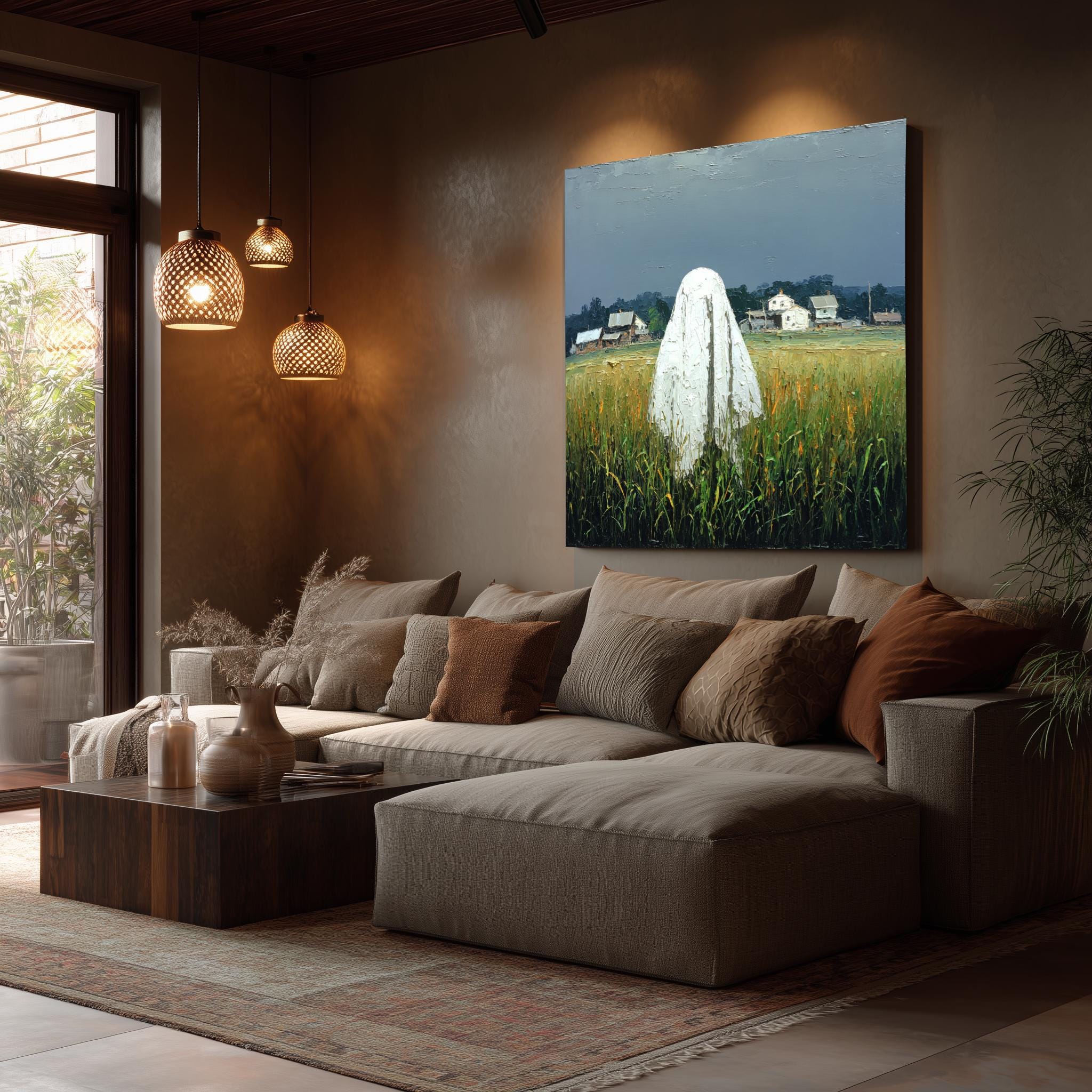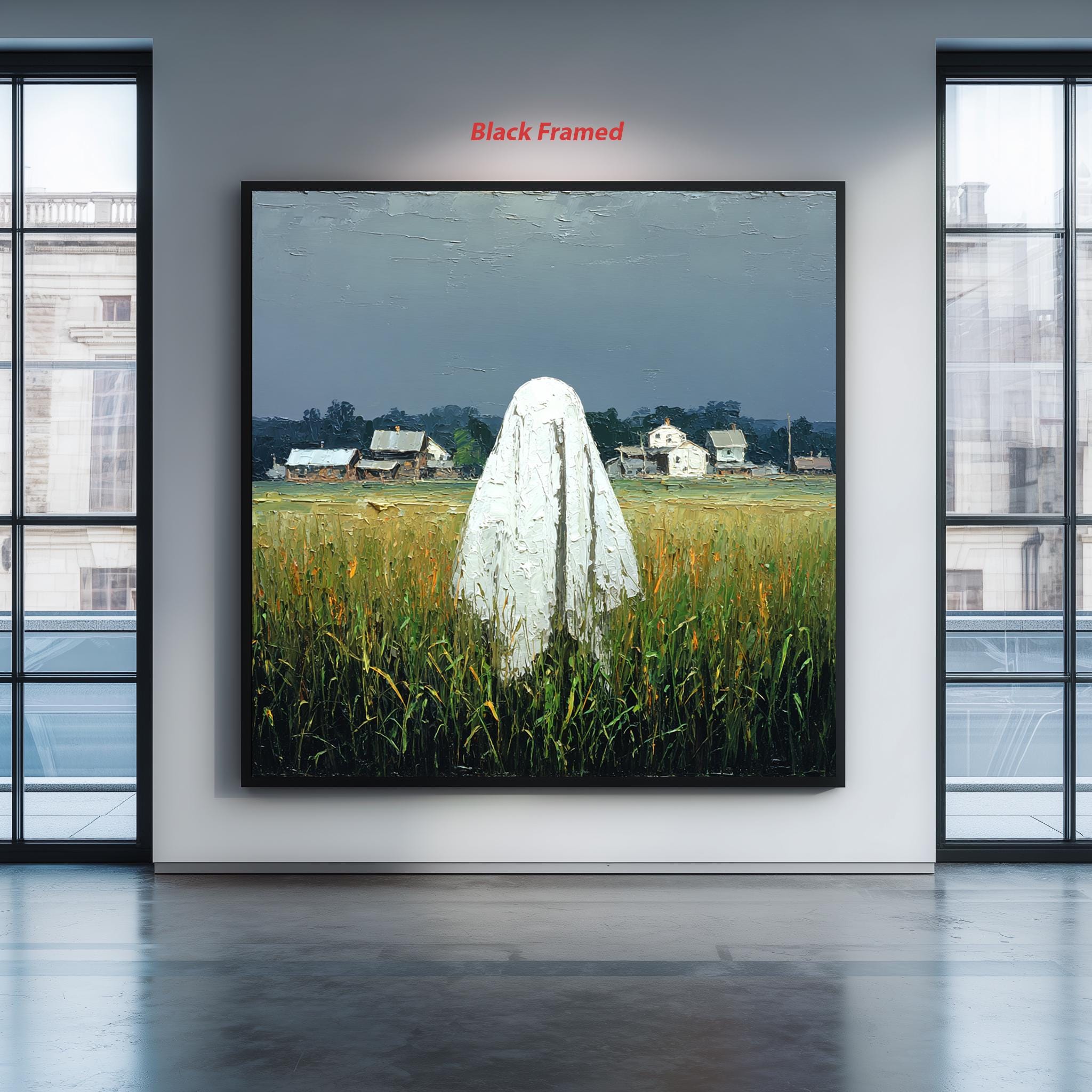 The Ghost in the Field Surreal Art Print is a stunning surreal ghost art print that combines a rural landscape with moody Halloween wall decor, perfect for adding an eerie yet elegant touch to gothic interiors. This oil print style artwork captures an eerie ghost scene with intricate details that evoke both mystery and calm, making it ideal for fans of creepy cute decor and farmhouse wall art alike. Measuring precisely 18 by 24 inches, this high-quality oil style artwork delivers vivid colors and sharp contrast that enrich any living space.