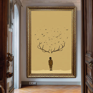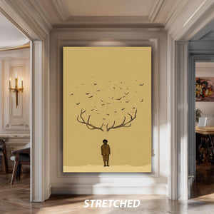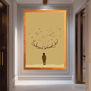 This surreal minimalist wall art titled 'Surreal Minimalist Boy with Antlers and Birds Wall Art' is a conceptual wall print that offers an emotional digital illustration designed to evoke a symbolic mind escape. Featuring a boy with antlers art motif, this modern abstract canvas blends psychological art poster elements with minimalist home decor to create a striking centerpiece. Inspired by color field painting and abstract expressionism art, this gallery wrapped canvas brings contemporary boho artwork style to mid century art print lovers and collectors.