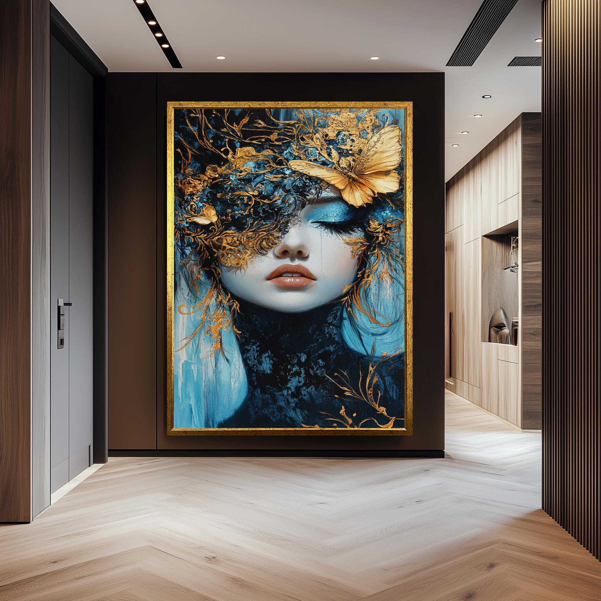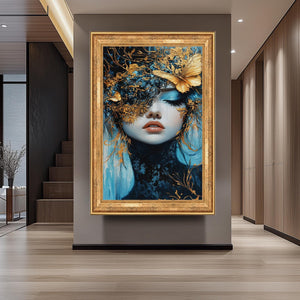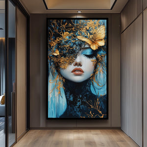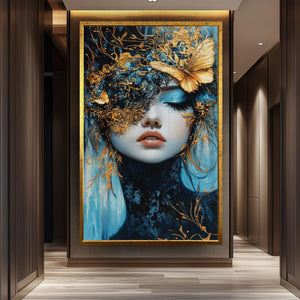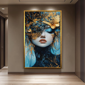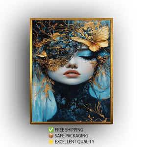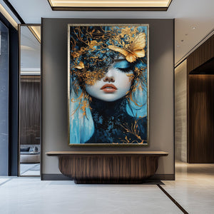 This elegant surreal wall art features a mesmerizing fantasy portrait art of a woman with gold mask, set against rich blue tones to create a dreamlike fantasy art experience. This luxury wall decor piece showcases a surreal butterfly painting with ethereal wall hanging qualities, enhanced by metallic accent artwork that adds depth and sophistication to any modern surreal decor. Crafted as custom canvas prints, this elegant portrait painting transforms your space with vivid colors and intricate details designed to captivate and inspire.