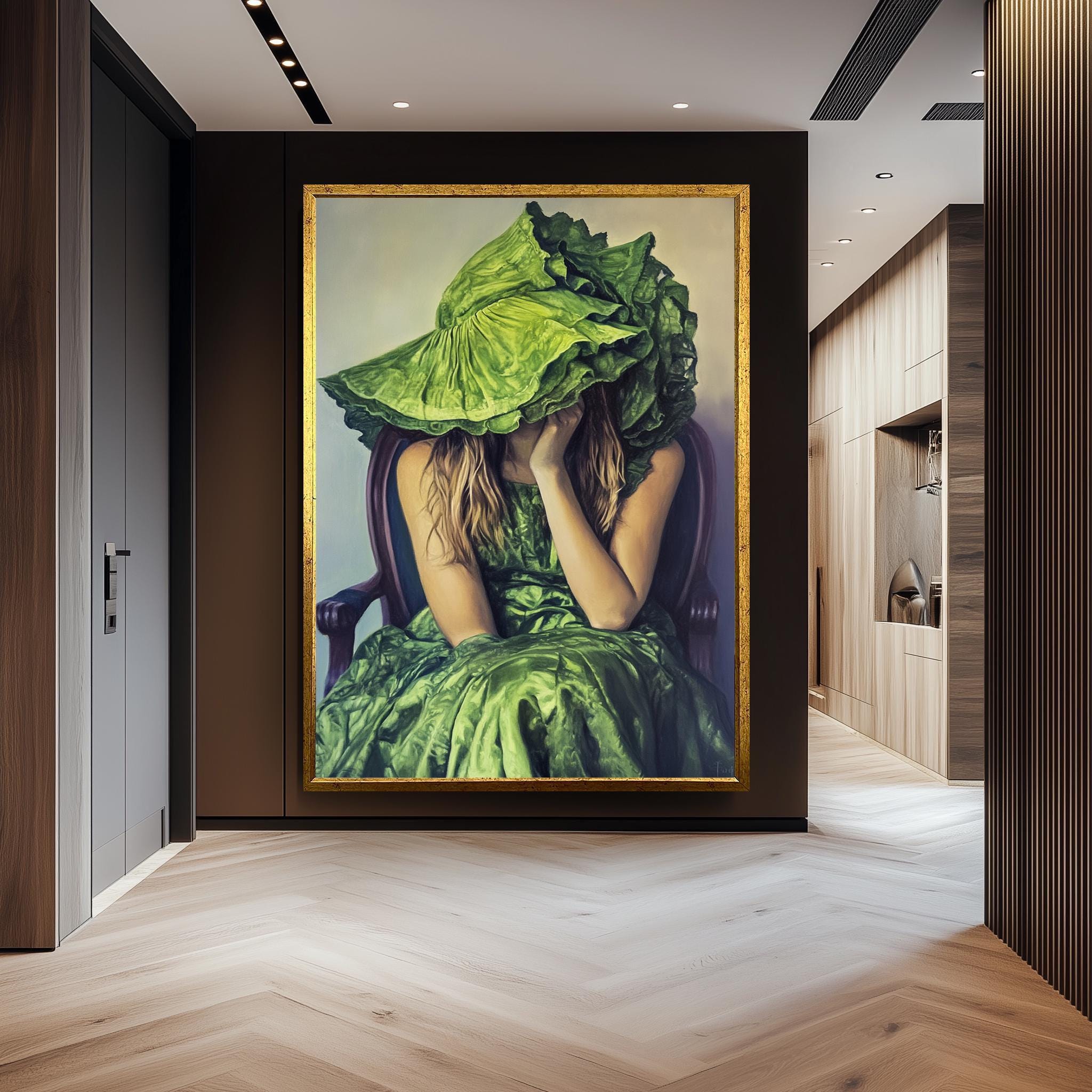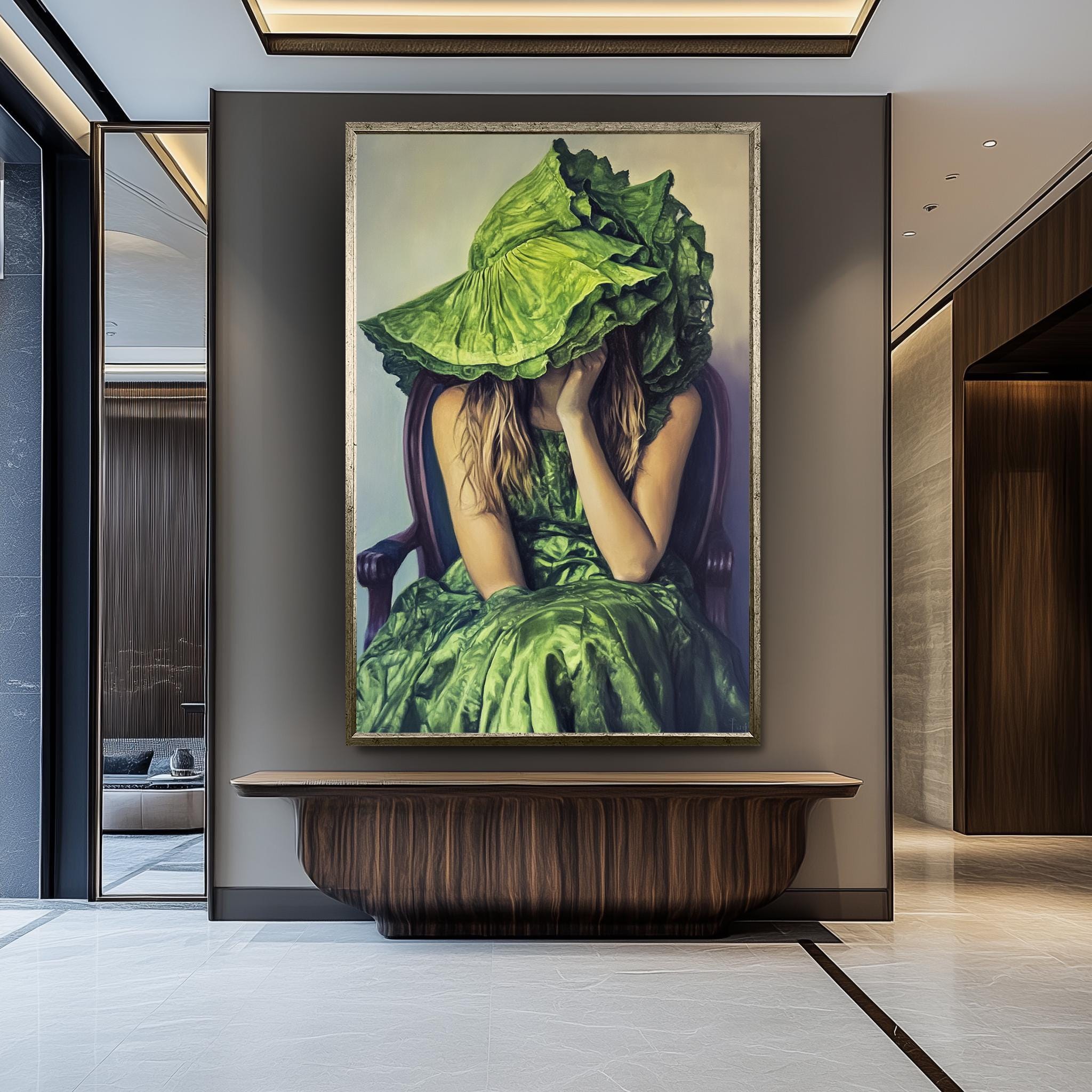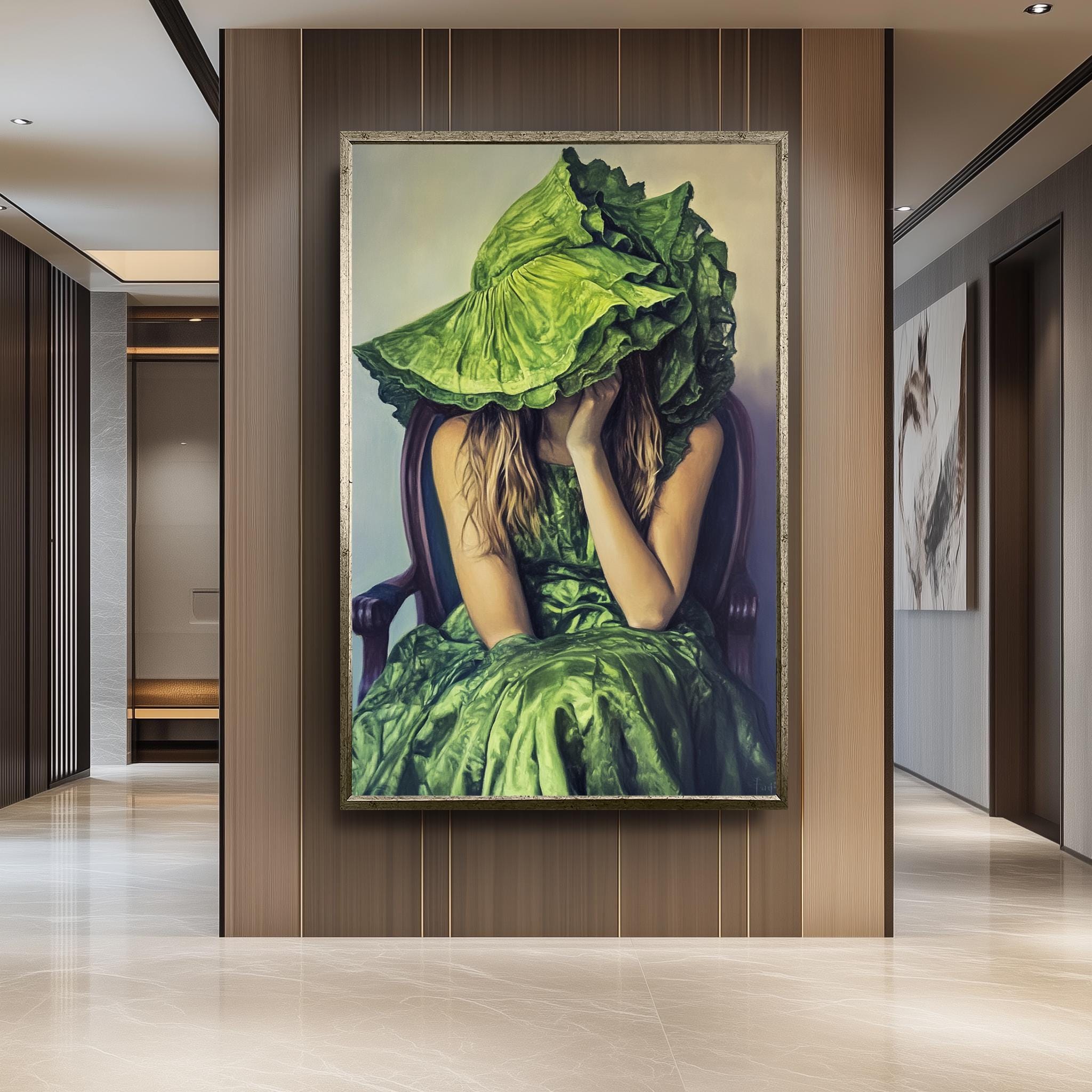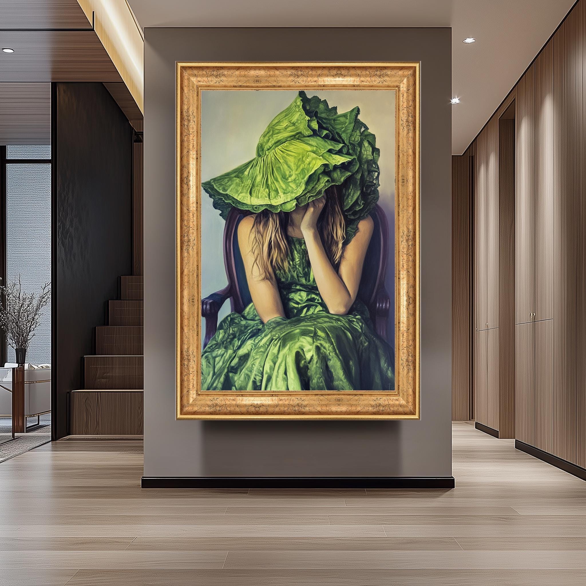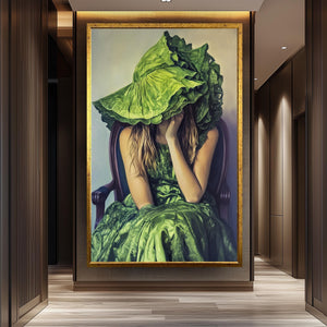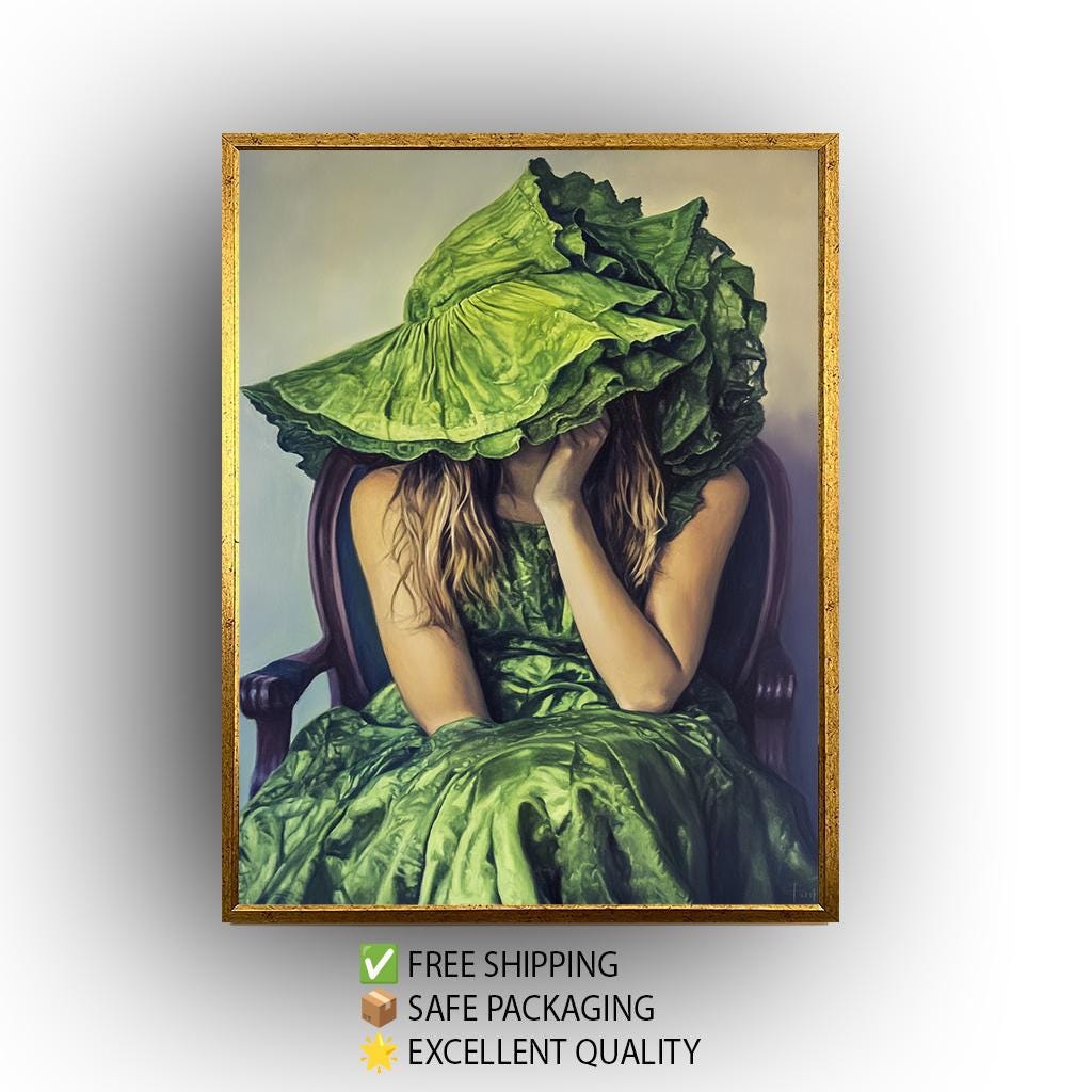 This surreal woman portrait oil painting captures a mysterious female figure dressed in an elaborate green dress and an oversized hat, blending whimsical art print qualities with haute couture style. The artwork delivers a captivating visual narrative that transforms any space into a refined gallery of fashion wall decor and conceptual woman art. Measuring up to 40x60 inches, this elegant portrait canvas offers rich oil painting art textures with vivid colors and dreamlike softness, perfect for adding vintage glam painting allure to feminine room decor.