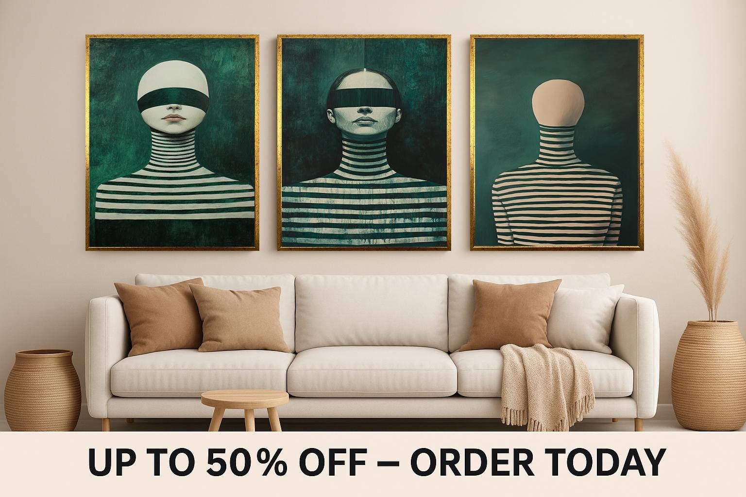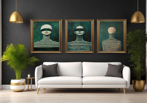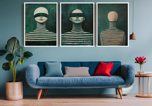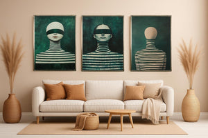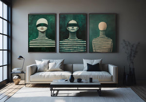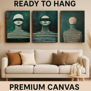 Each piece in this triptych wall art collection highlights faceless woman artwork and a blindfolded female portrait, creating a mysterious and captivating atmosphere. The use of deep green striped patterns enhances the visual impact, making these prints ideal for anyone seeking unique, modern aesthetics in their home or office.