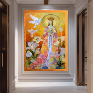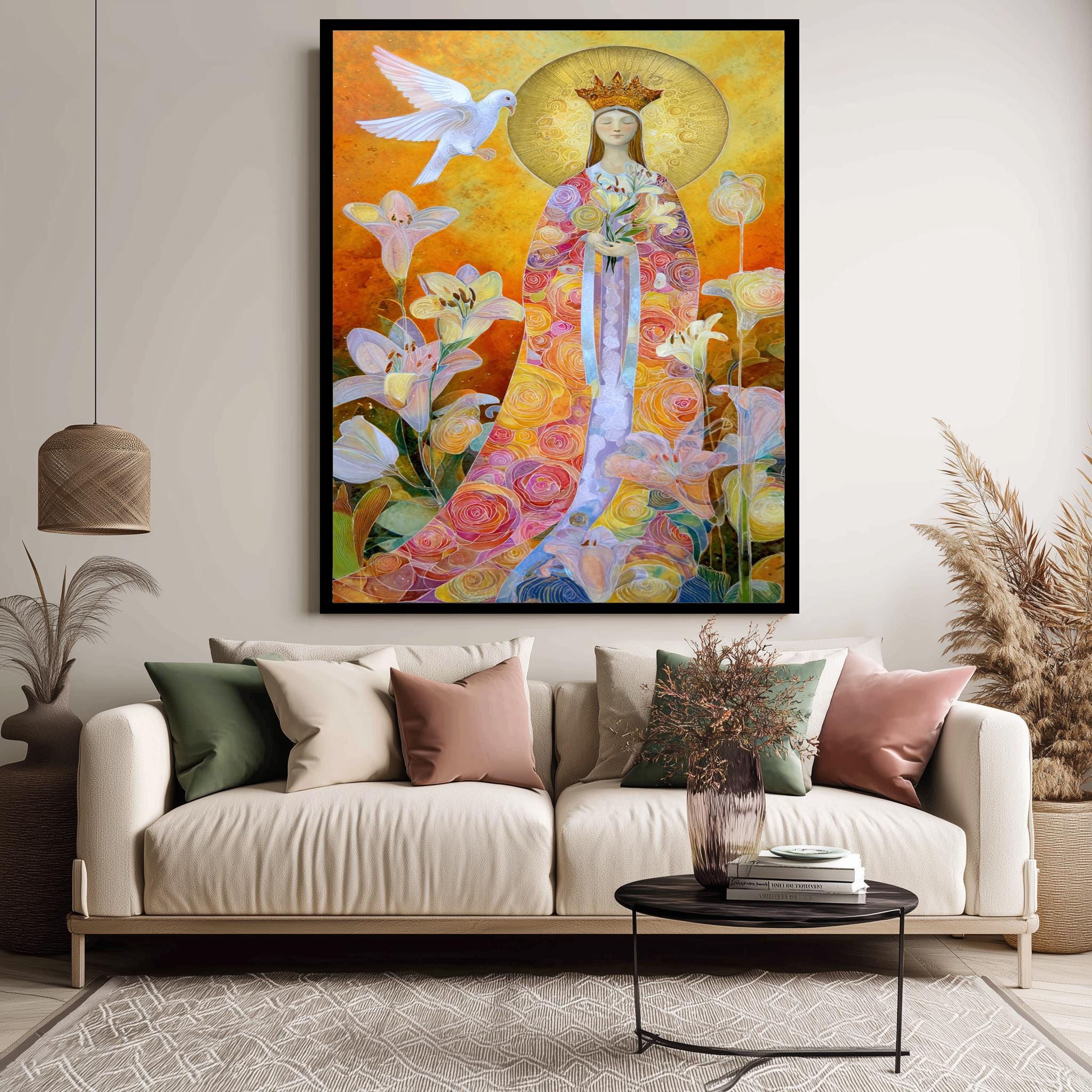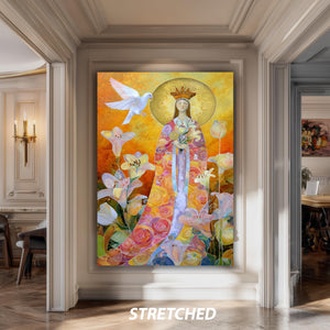 This Virgin Mary art print brings a vibrant and spiritual touch to your space, featuring the Queen of Heaven in a colorful Mary illustration that blends traditional reverence with modern sacred art. Perfect for those seeking Catholic wall art that inspires faith and beauty, this floral Madonna art captures the essence of the holy mother through a digital print that radiates warmth and devotion. Printed on museum-quality gallery wrapped canvas, this mid century wall decor piece offers a lasting tribute to Marian themes while fitting seamlessly into minimalist religious artwork collections.