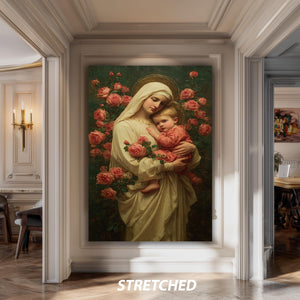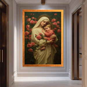 This Virgin Mary art print beautifully captures the sacred bond between the Holy Mother and Jesus, offering a timeless spiritual wall hanging that enriches any Christian home decoration. Featuring a delicate rose floral motif, this classic religious art print blends traditional reverence with modern spiritual decor, making it an ideal centerpiece for those seeking both faith and elegance in their living spaces. Printed using advanced digital Mary art techniques on high-quality canvas, this piece delivers vibrant colors and fine details that last.