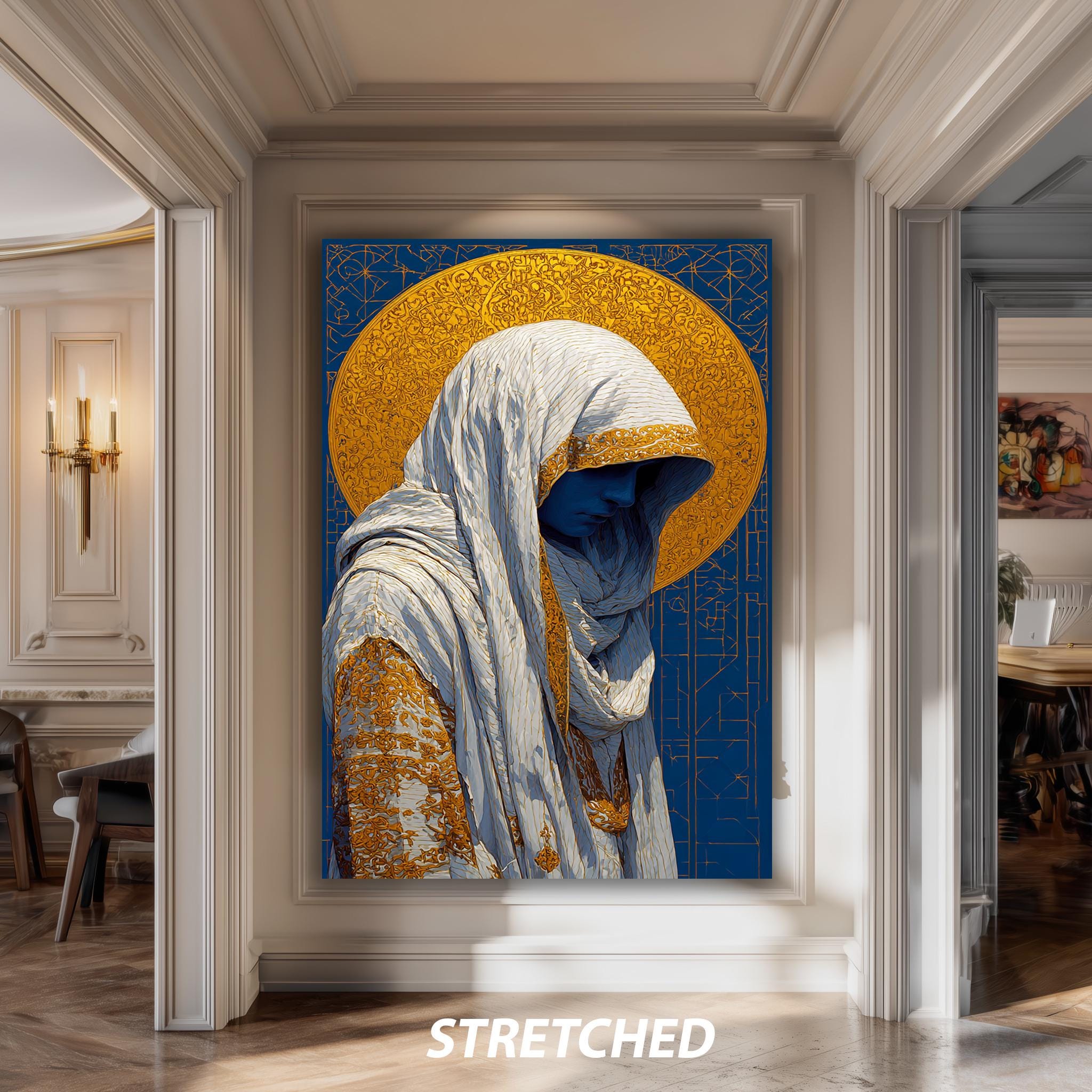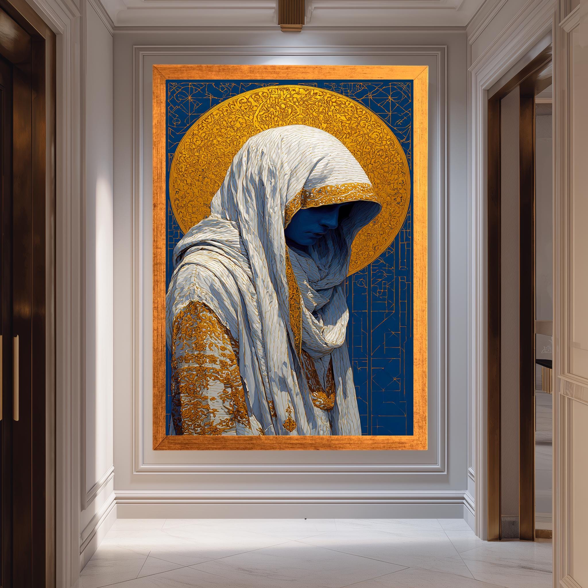 This Modern Virgin Mary art print beautifully captures the sacred essence of the Holy Mother with a radiant gold halo, making it a stunning Catholic wall art piece that inspires devotion and adds spiritual grace to any room. This Marian digital print features a timeless portrayal of the Blessed Virgin image, designed to elevate your space with divine feminine art that resonates deeply with Christian faith and tradition. Printed with high-resolution techniques on premium canvas, this sacred mother decor offers vivid colors and fine details that bring the Modern Madonna artwork to life.