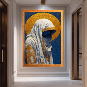 This gold halo poster measures from 8"x12" (20x30cm) up to an impressive 59"x98" (150x250cm), allowing you to choose the perfect size for your home, office, or prayer space. Available as a roll (unframed) for custom framing or as a stretched canvas gallery wrap on sturdy wooden bars, this religious canvas decor is ready to hang and instantly enhances any wall with its abstract religious art style. Frame options include classic gold, silver, black, white, and brown finishes, as well as luxury aged gold and antique silver frames.