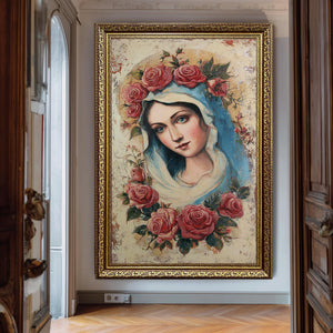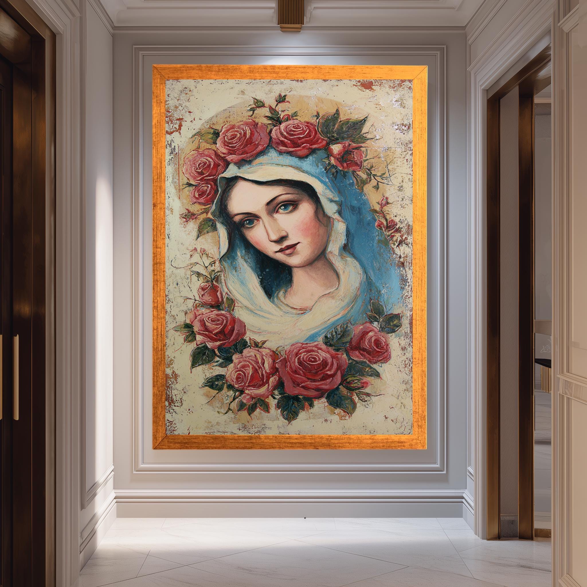 Experience the lasting beauty and devotion embodied in this sacred artwork. Elevate your Christian home decoration with this exquisite Virgin Mary art print that celebrates faith through vintage charm and floral elegance.