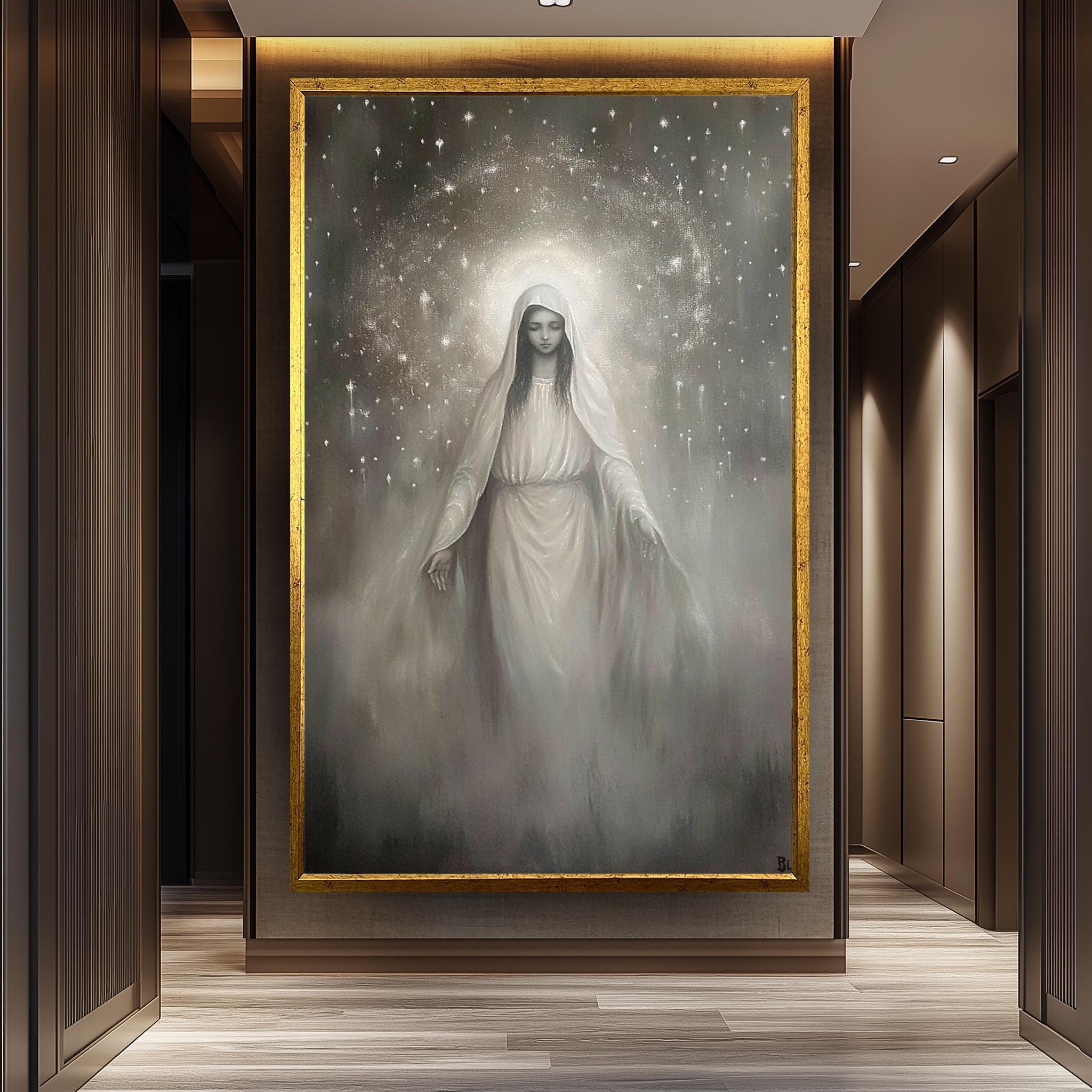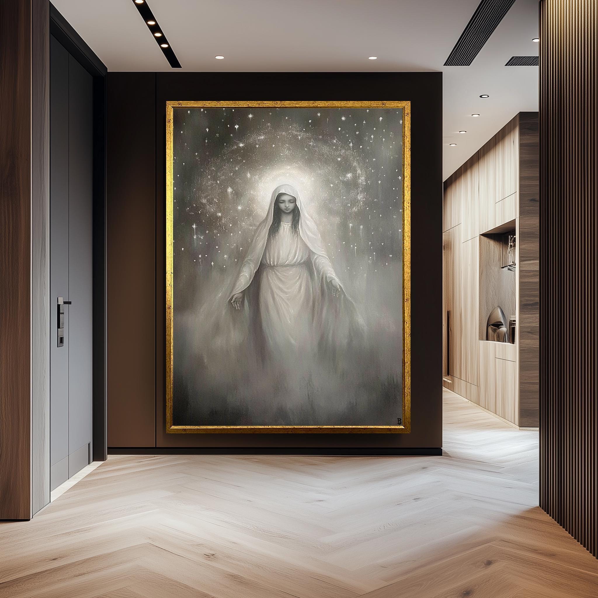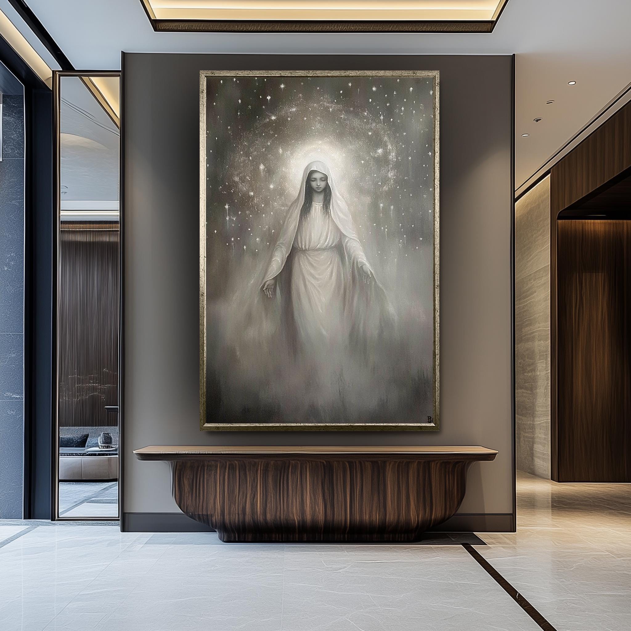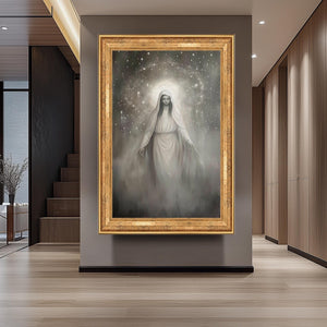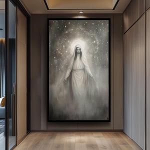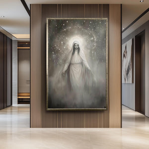 Virgin Mary Canvas Art – Monochrome Celestial Painting | Premium Religious Wall Art