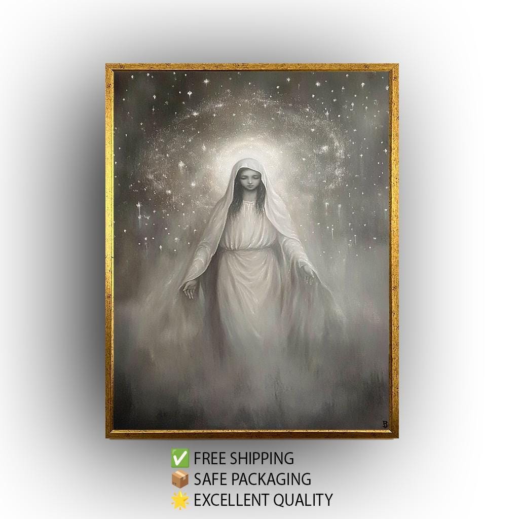 This Virgin Mary canvas art beautifully captures a celestial moment of grace, making it an inspiring addition to any sacred or prayer space. Featuring a monochrome canvas design, this religious wall art depicts the Virgin Mary glowing in white robes against a starry night sky, evoking peace and spiritual wonder. Printed on premium cotton canvas and expertly hand stretched on a sturdy wooden frame, this monochrome painting transforms your wall into a serene sanctuary that encourages reflection and faith.