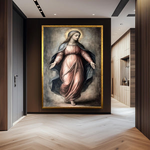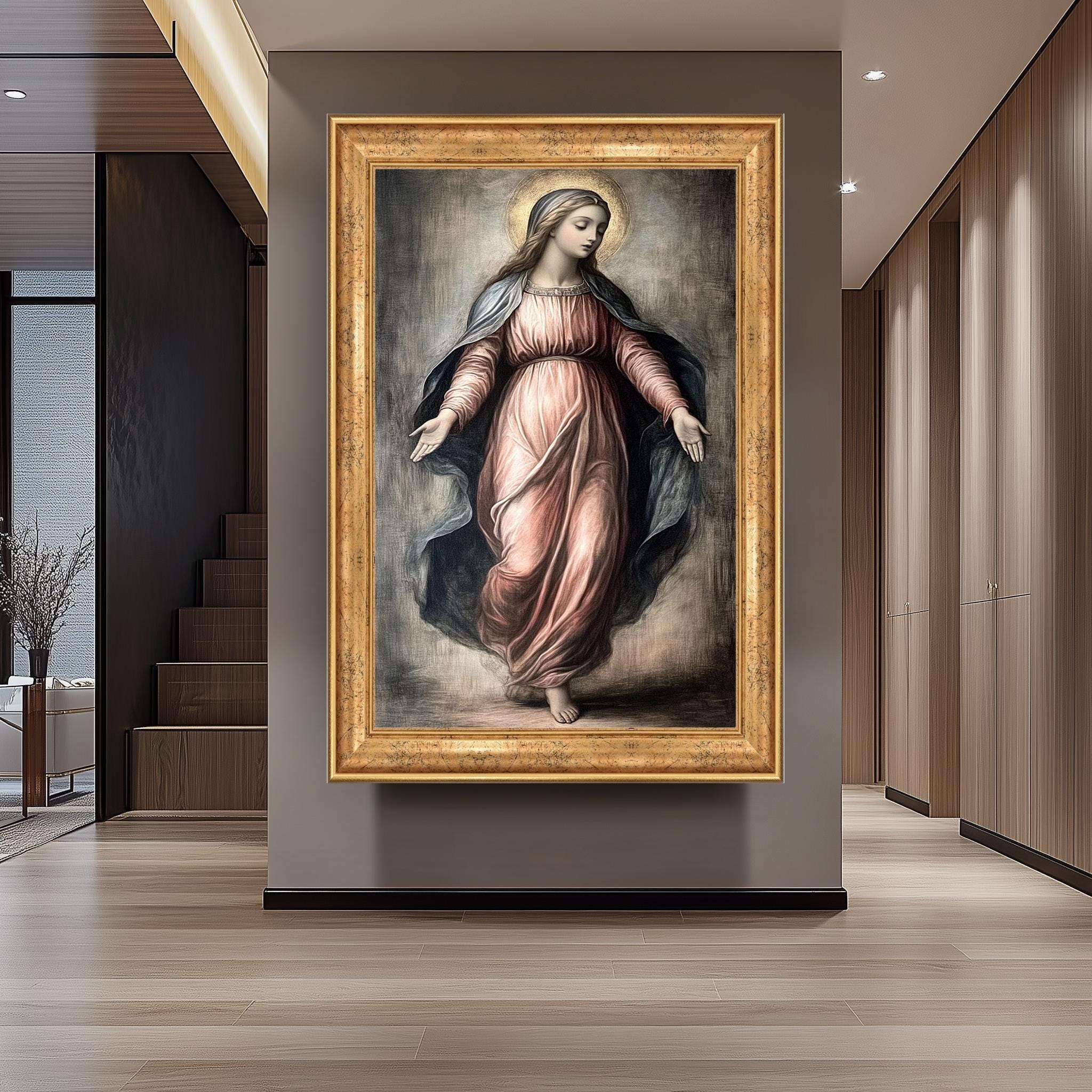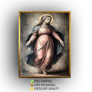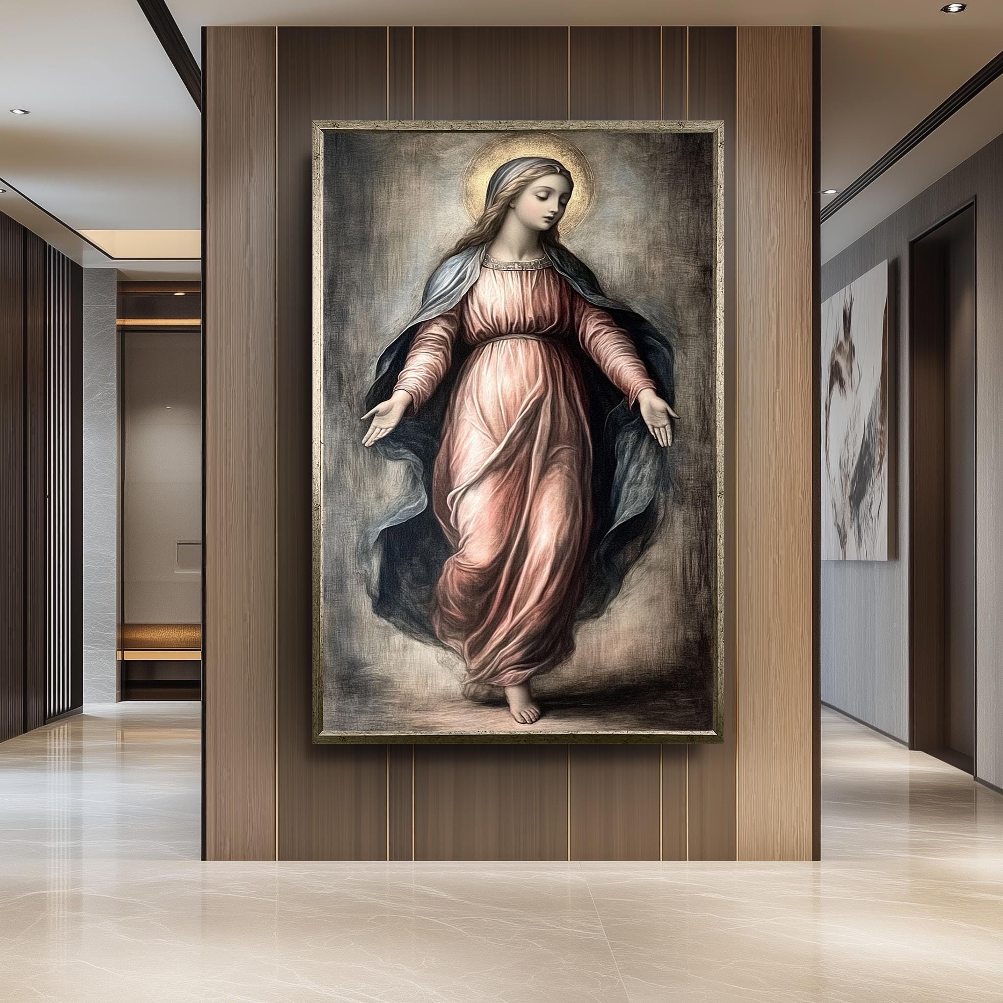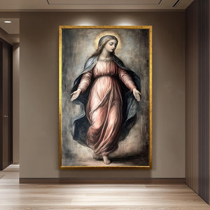 This exquisite Virgin Mary painting captures divine femininity and spiritual serenity, making it an ideal Catholic wall art piece for prayer room decor. Featuring Mary in a flowing rose gown with a golden halo, this Renaissance canvas art brings a timeless sacred space canvas to your home or altar. The classic religious print portrays the holy mother artwork with gentle movement and open-armed blessing, inspiring daily faith reflection.