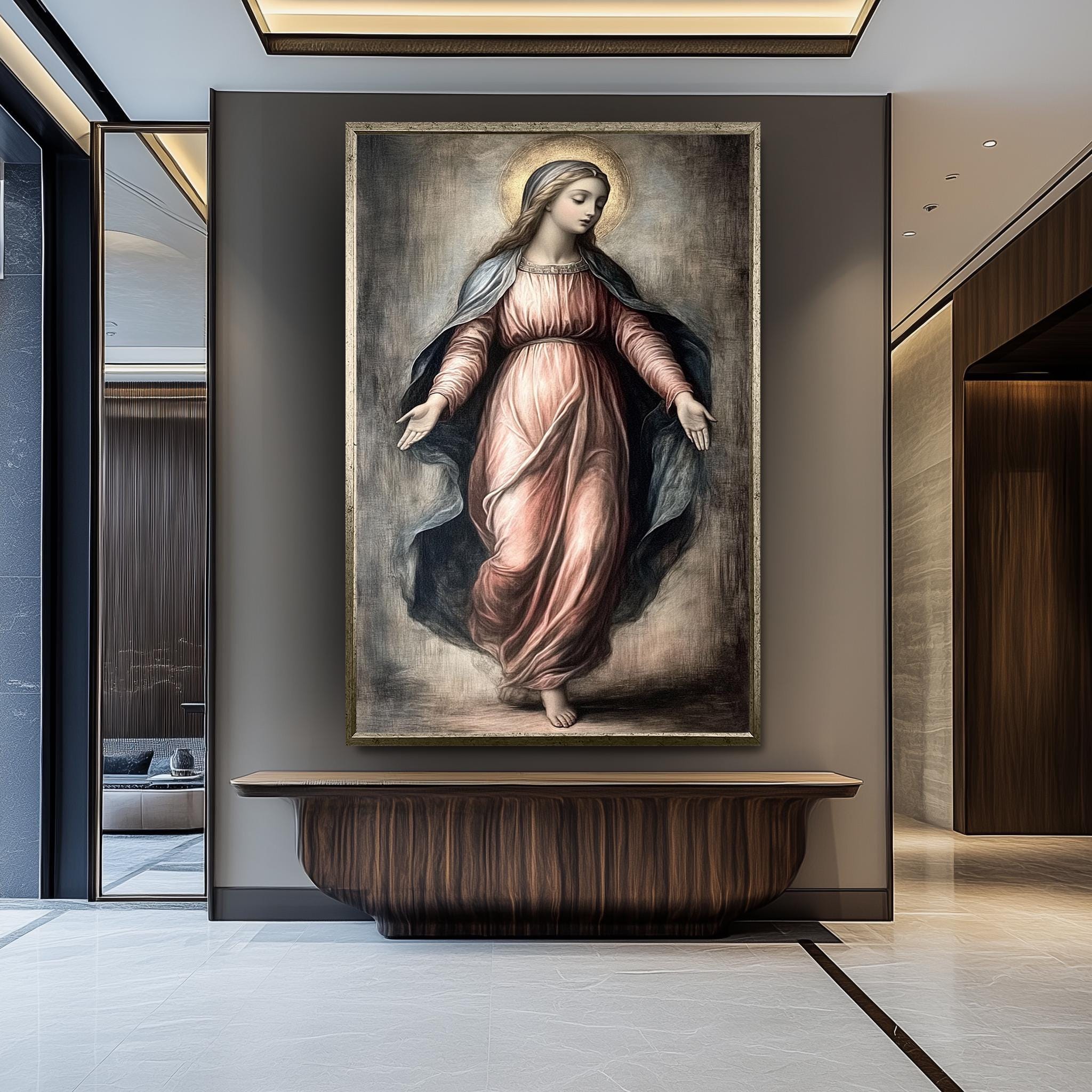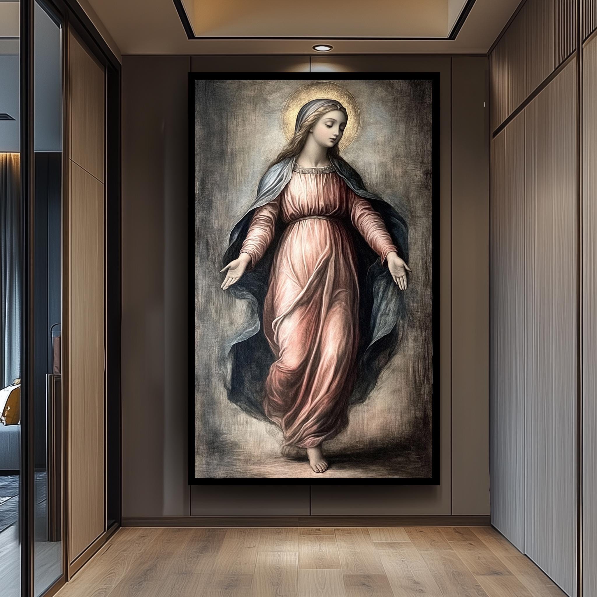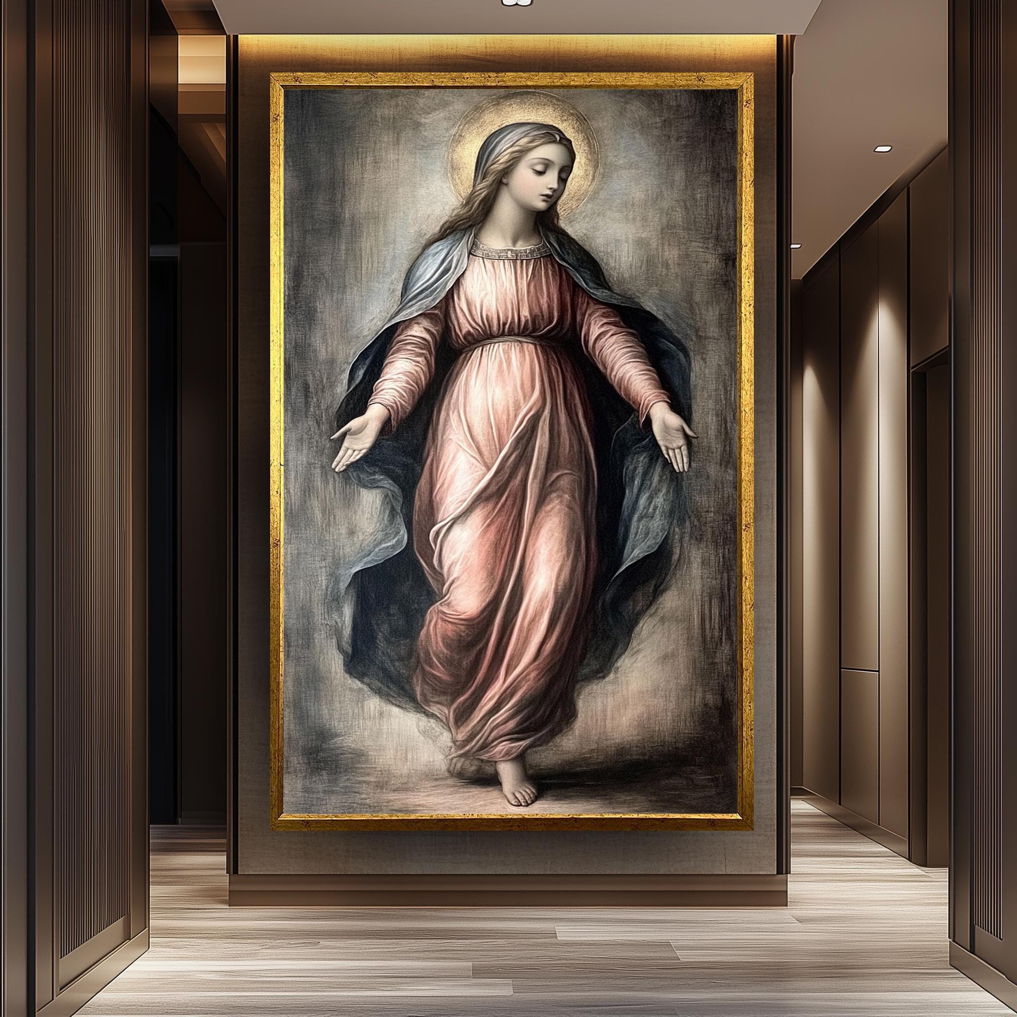 This exquisite Virgin Mary painting captures divine femininity and spiritual serenity, making it an ideal Catholic wall art piece for prayer room decor. Featuring Mary in a flowing rose gown with a golden halo, this Renaissance canvas art brings a timeless sacred space canvas to your home or altar. The classic religious print portrays the holy mother artwork with gentle movement and open-armed blessing, inspiring daily faith reflection.