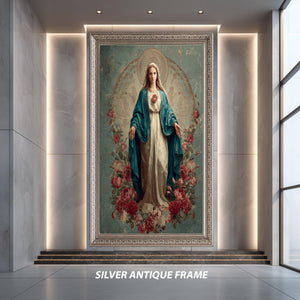 Choose this spiritual religious print to transform your space with meaningful artistry that celebrates the sacred. The combination of blue and white art tones with roses wall decoration creates a peaceful yet powerful visual tribute to the holy mary artwork. Elevate your faith inspired decor today with this exquisite devotional catholic print.