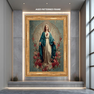 Virgin Mary Wall Art - Sacred Blue and White Catholic Devotional Print with Roses