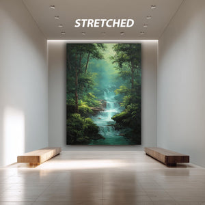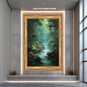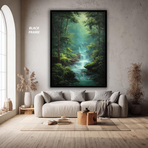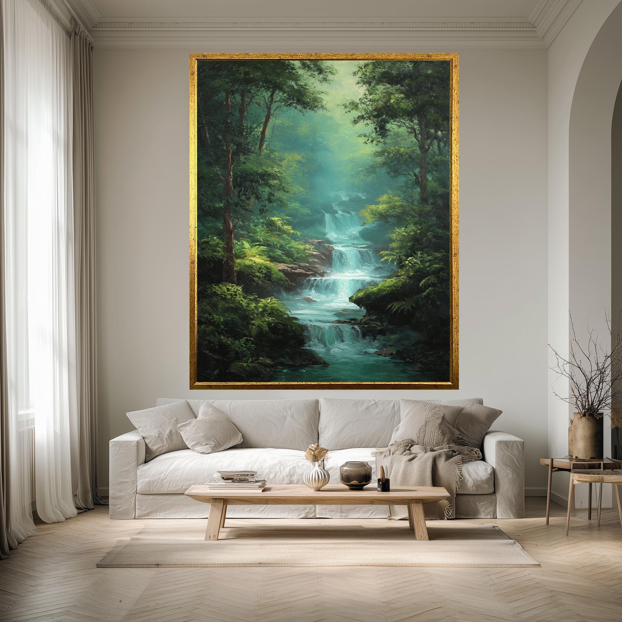 Whether you want to enhance your home or office with forest nature print elegance or gift someone a piece of peaceful nature painting, this serene waterfall forest art print is an ideal choice. Its calming misty green landscape and tranquil jungle wall decor style bring warmth and inspiration to any environment.