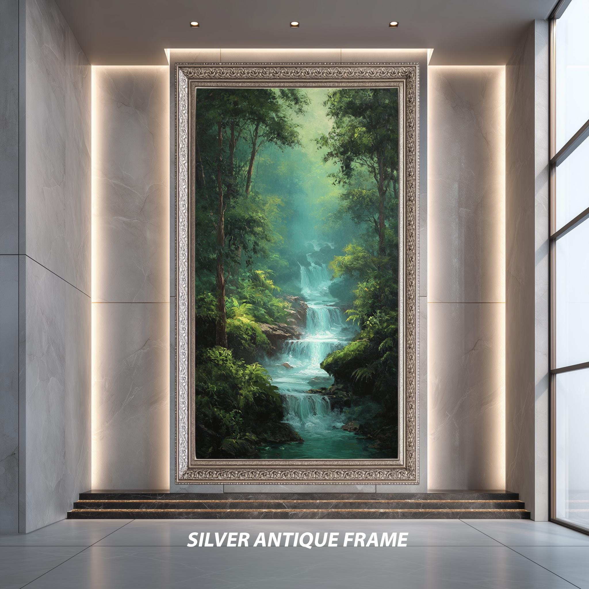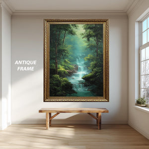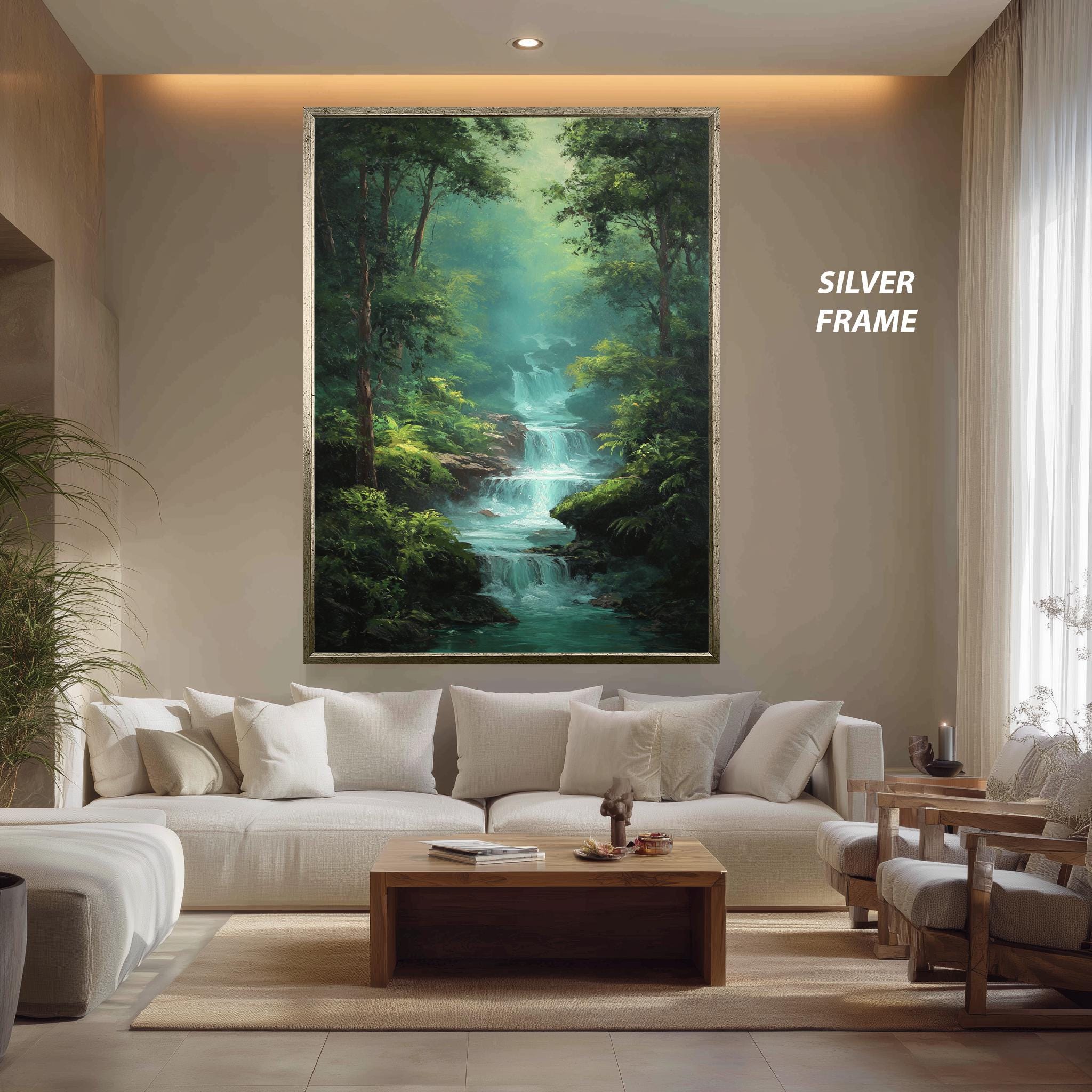 The Serene Waterfall Forest Art Print is a stunning waterfall forest art print designed to bring a calming and peaceful atmosphere to your space. Featuring a misty green landscape, this peaceful nature painting captures the tranquil jungle wall decor vibe with its tiered waterfall art and lush green landscape art. Perfect for anyone seeking relaxing nature art, this nature scene poster adds a serene jungle print touch that enhances any room with calm green decor and outdoor wall art beauty.
